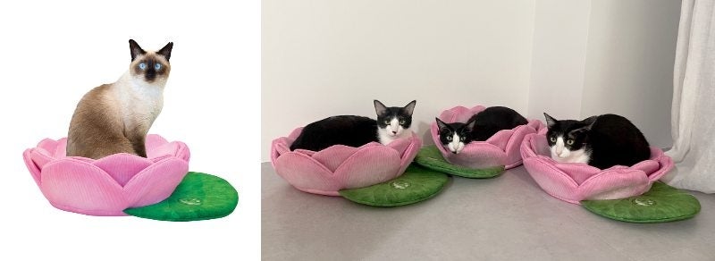 蓮の上に居る猫さまの姿に思わず手を合わせてしまう「尊い猫さまを拝もう 蓮の花にゃんこクッション」がフェリシモ「猫部™」から新登場