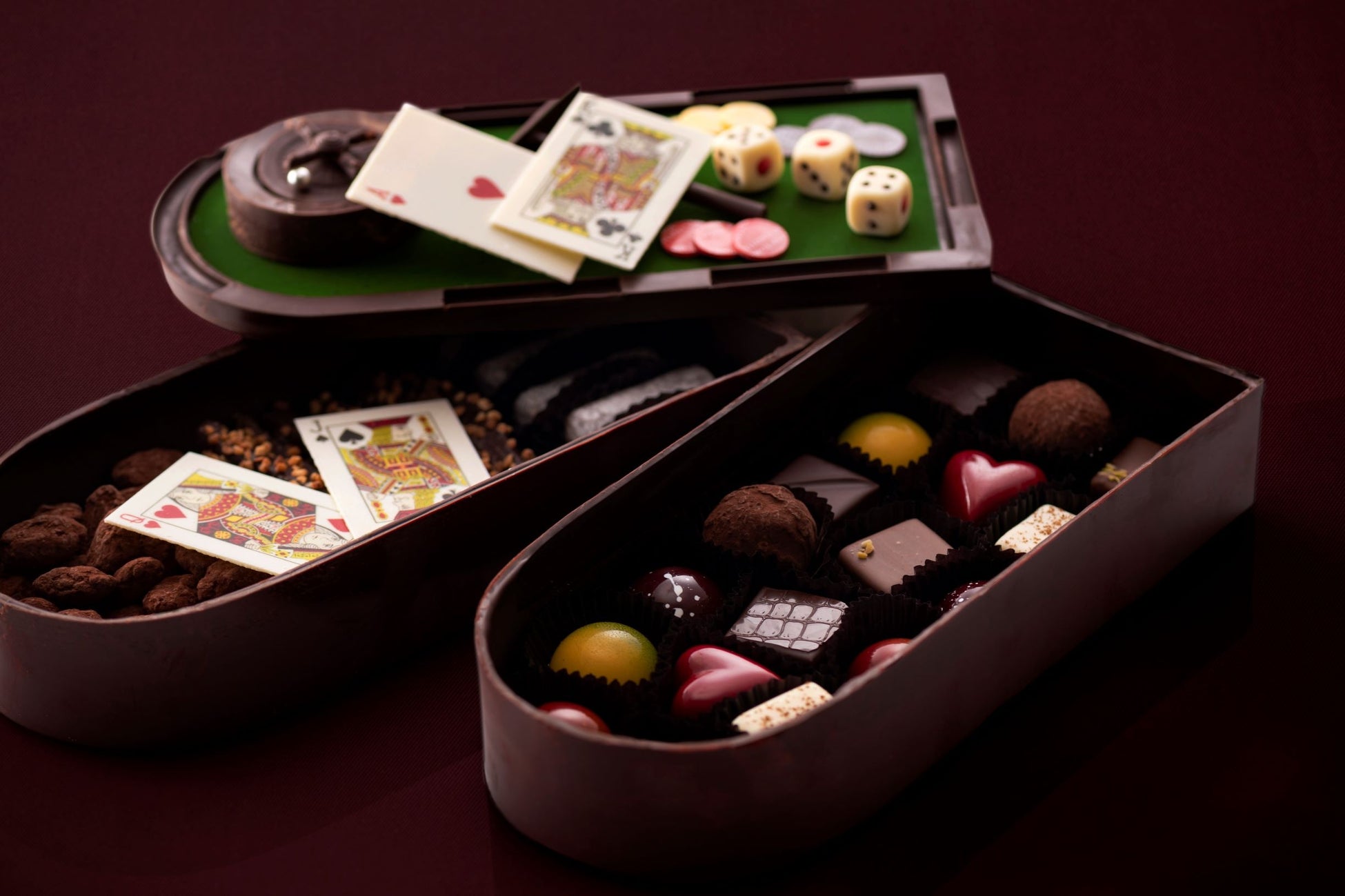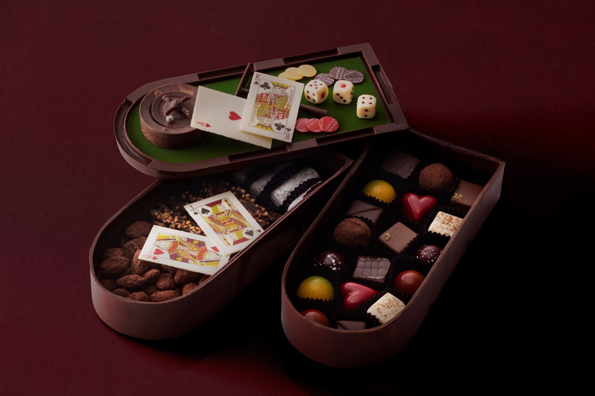 「CASINO 2024~運命のいたずら~」は2013年の販売開始以来、ホテルを代表するチョコレートとして毎年ご好評をいただいています。ルーレット、ディーラースティック、ダイス、カジノテーブルを表現したボックスに至るまで全てをチョコレートで精巧に再現し、パティシエの卓越した技術とこだわりが凝縮したフォトジェニックな逸品です。10個限定商品のため、ホテル公式ウェブサイトに予約専用URLをご用意し販売いたします。