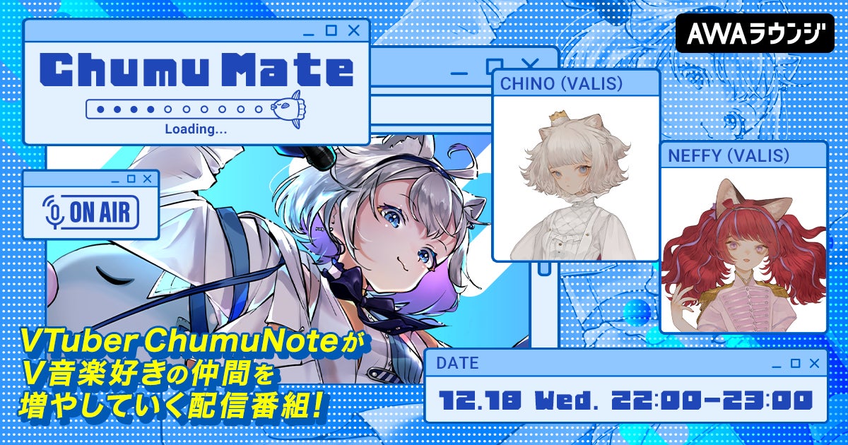 AWA株式会社(本社:東京都港区、代表取締役CEO:冨樫晃己)が運営する、サブスクリプション型(定額制)音楽ストリーミングサービス「AWA(アワ)」は、2024年12月18日22:00~23:00の1時間に渡り、無料で誰でも参加できるオンライン空間「ラウンジ」で、VTuberのChumuNoteがゲストアーティストと共に楽曲を深掘りし、V音楽好きの仲間を増やしていく音楽番組『ChumuMate』の第4回を開催いたします。