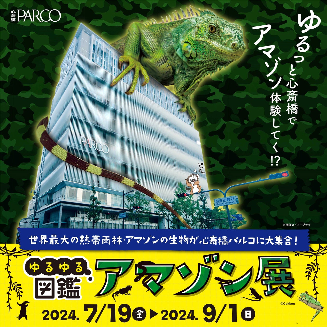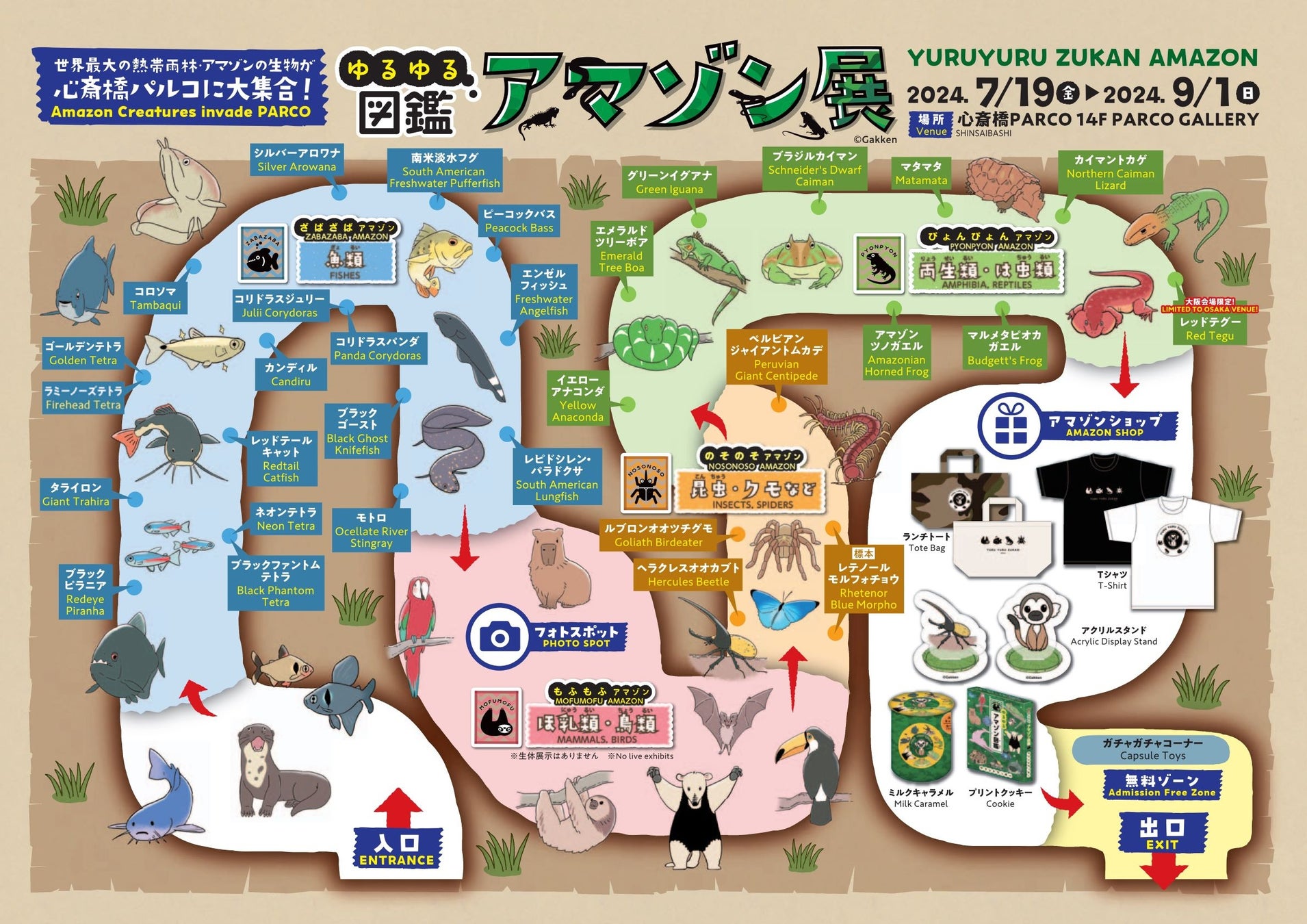 心斎橋PARCO 14F PARCO GALLERY(大阪府大阪市中央区心斎橋筋1-8-3)にて、 2024年7月19日(金)から9月1日(日)の45日間開催する、株式会社Gakken発行の「ゆるゆる図鑑」シリーズの1冊『ゆるゆるアマゾン図鑑』の世界観をもとにした生体展「ゆるゆる図鑑アマゾン展」が開幕いたしました。