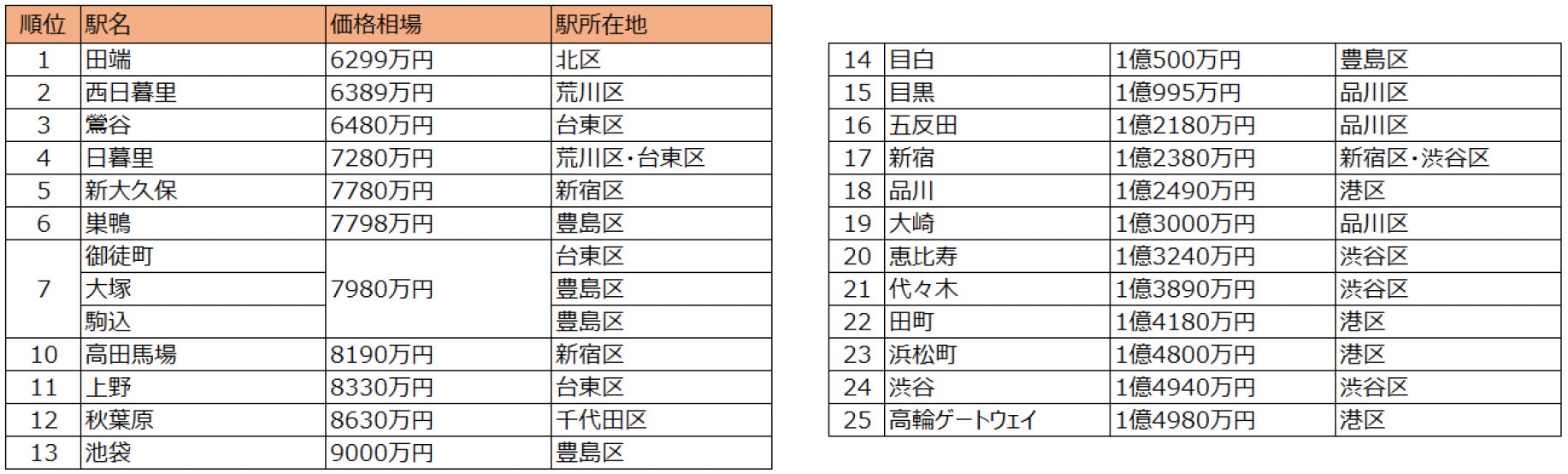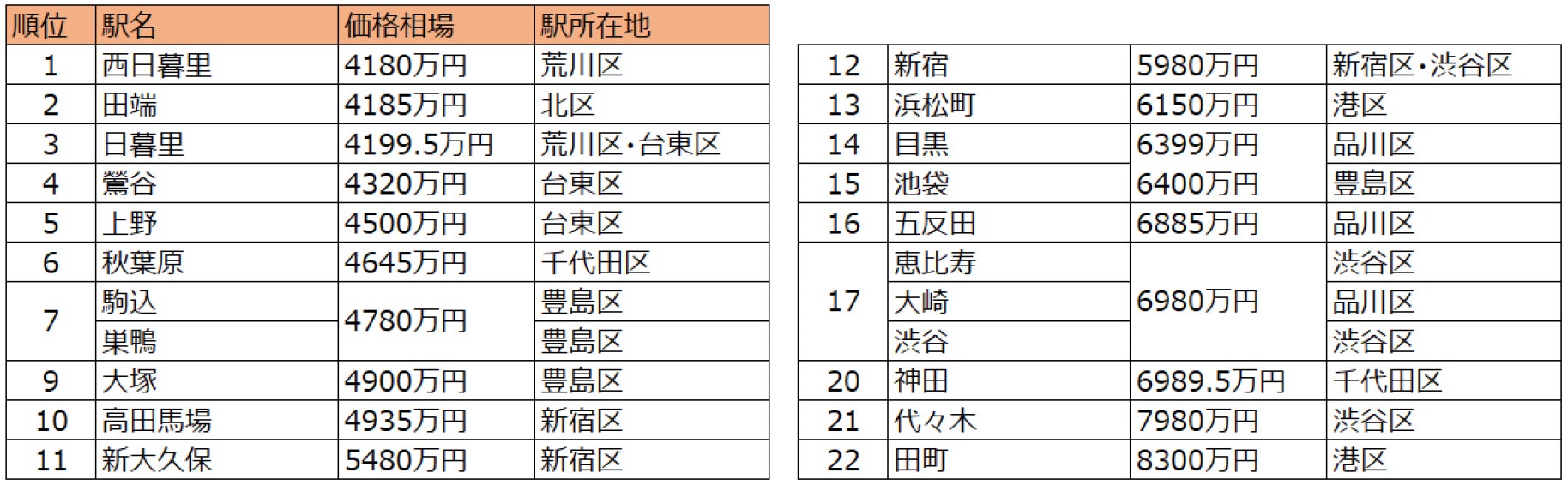 ※神田(千代田区)、東京(千代田区)、有楽町(千代田区)、新橋(港区)、原宿(渋谷区)の各駅は調査対象物件数が20件以下のためランク外