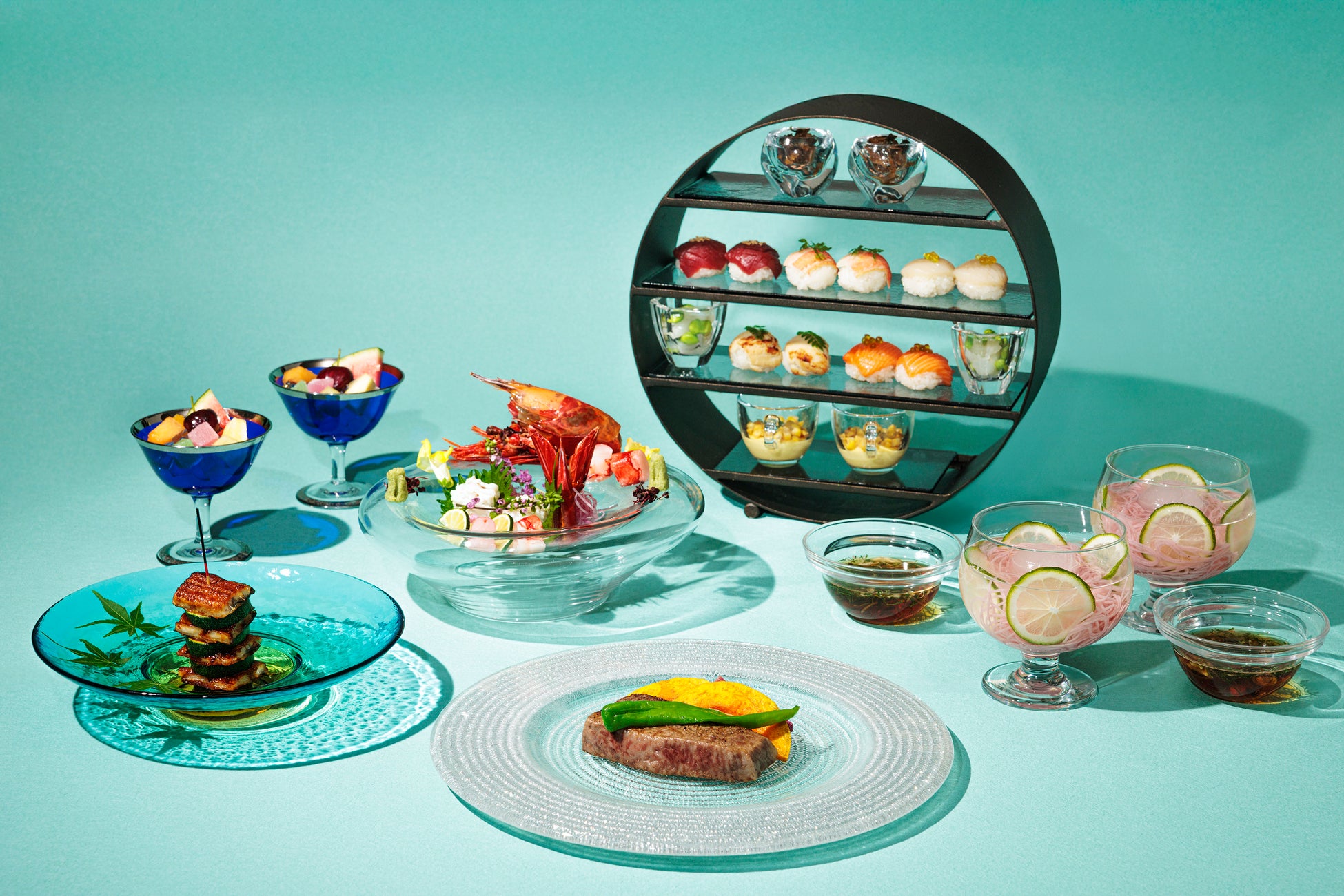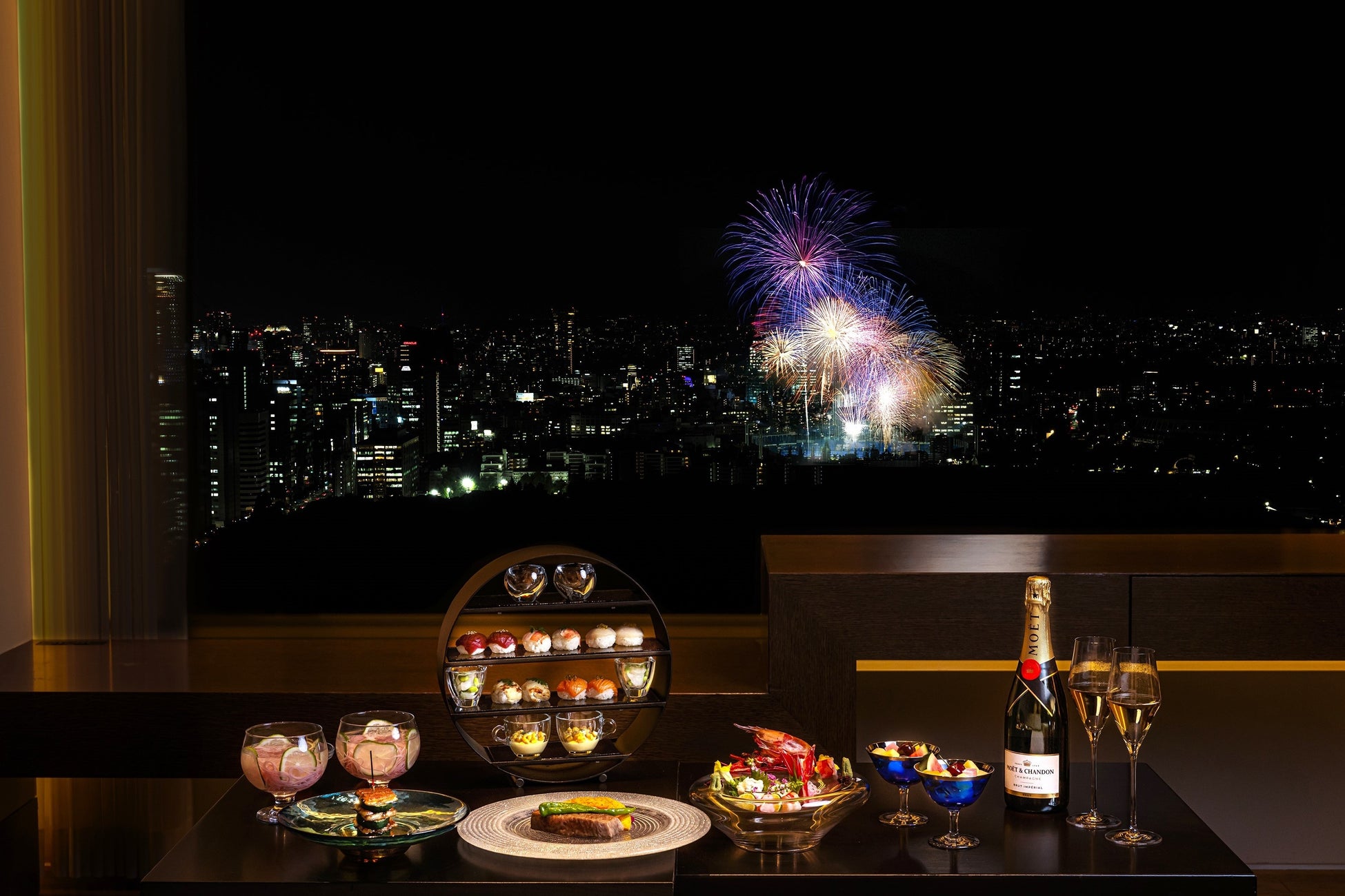 広大な景色を望める角部屋の紀尾井スイートでは、“涼”をテーマに料理長が考案した夏ならではのスペシャルディナーをご用意。鰻や鱧など季節の食材に加え、和牛ステーキやズワイ蟹の手毬寿司など、夏祭りを楽しむようにカラフルな料理をクリアな器に並べます。スイートルームの客室から料理長こだわりのメニューと共に花火をご観賞いただけます。そのほか、花火大会が開催される明治神宮外苑側客室確約のシャンパンボトル付きプランなどを販売いたします。