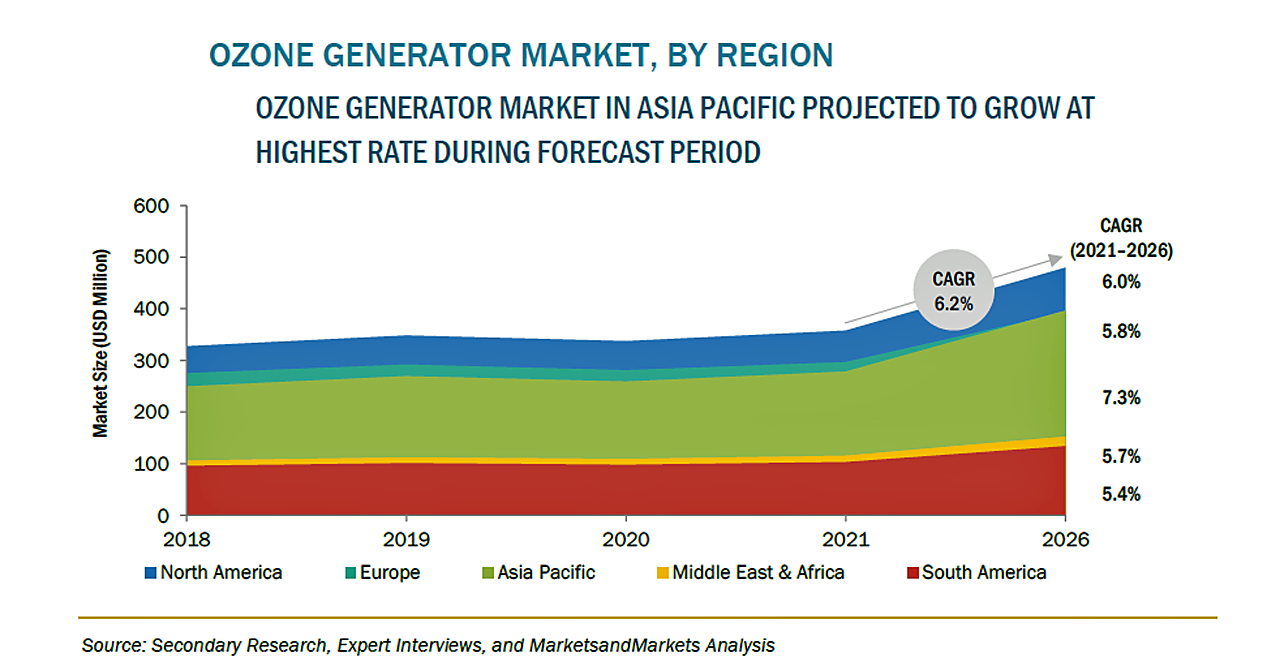 オゾン発生装置の市場規模は、2020年から2026年までの間CAGR 6.2%で成長し、2021年の11億米ドルから2026年には15億米ドルに達すると予測されています。世界各地で水不足が深刻化していることに加え、自治体の水処理施設でのオゾン発生装置の需要が高まっていることから、オゾン発生装置市場の成長が加速すると予想されます。
