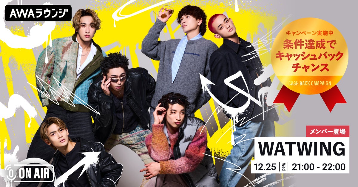 AWA株式会社(本社:東京都港区、代表取締役CEO:冨樫晃己)が運営する、サブスクリプション型(定額制)音楽ストリーミングサービス「AWA(アワ)」は、2024年12月25日(水) 21:00~22:00にて、無料で誰でも参加できるオンライン空間「ラウンジ」で、6人組ダンス&ボーカルグループ「WATWING」が音声とチャットで参加するAWAラウンジを開催いたします。