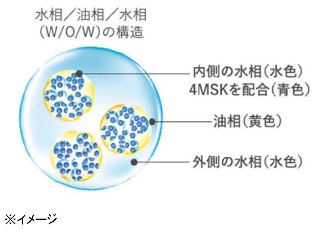 美白有効成分 4MSKと水相/油相/水相(W/O/W)処方を組み合わせ、最内水相に 4MSK を配合した処方