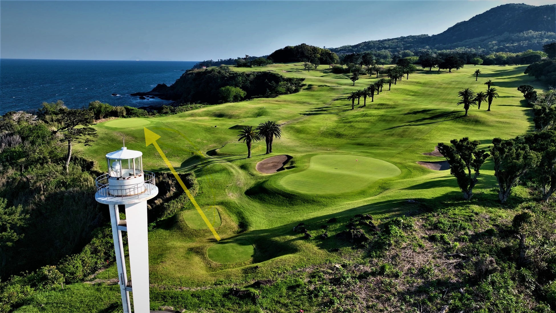 「大倉ホール」は、川奈ホテルの創業者・大倉喜七郎が特別に設けた約150ヤードのショートホール。通常ではラウンドすることのできない非公開のこのホールは、灯台下の高台に位置し、幕末期に黒船を迎え撃つために築かれた砲台跡地にグリーンが設けられており、本当の意味での“砲台グリーン”として知られています。