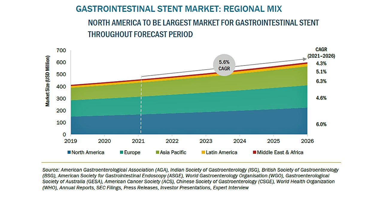 消化管(GI)ステントの市場規模は、2021年の4億5700万米ドルからCAGR5.6%で成長し、2026年には6億米ドルに達すると予想されています。消化管ステントは、消化管の閉塞を引き起こす疾患の緩和治療を目的としており、消化管腫瘍の再疎通や術後のリークシールに大きな役割を果たします。その他にも、薬剤溶出デバイス、良性疾患の組織モデリング、GI管のドレナージおよび吻合などの用途が考えられます。消化管ステント市場の成長は、消化管癌やその他の消化器系疾患の有病率の上昇、ライフスタイルの変化、消化管処置に対する医療費の増加、低侵襲手術への嗜好の高まりなどに起因しています。