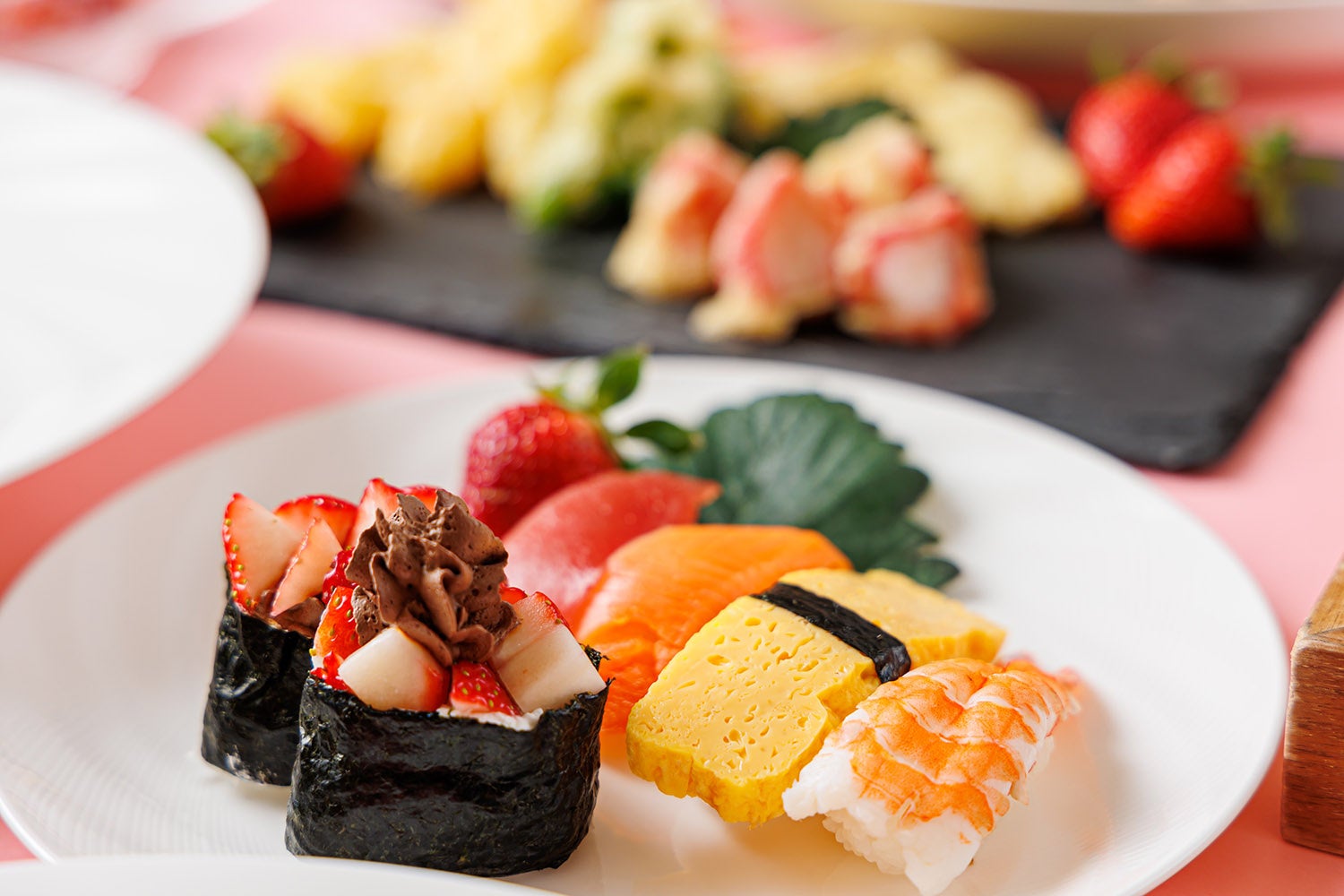 お寿司(いちごの軍艦・鮪・トラウトサーモン・海老) /いちごの麻婆豆腐/