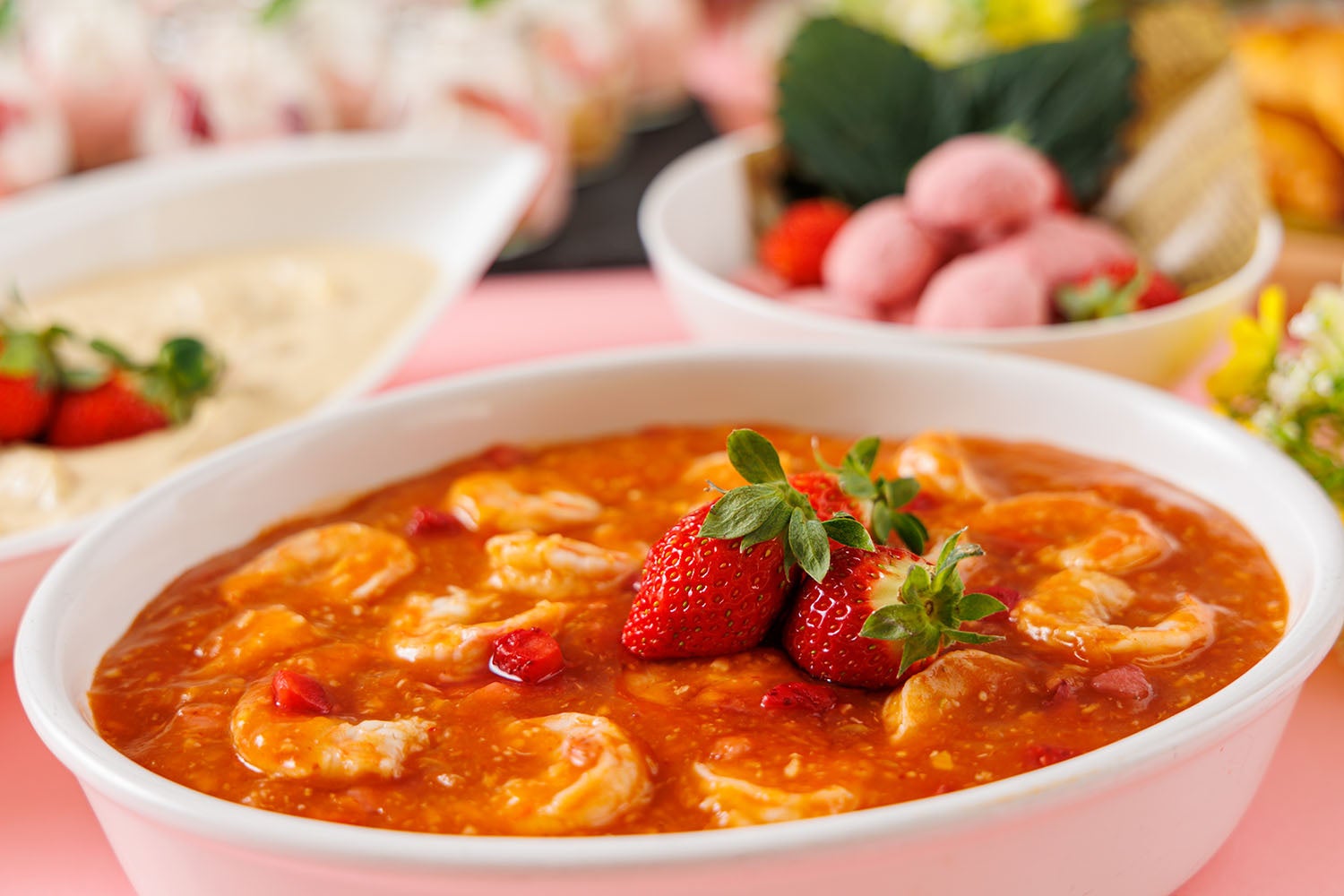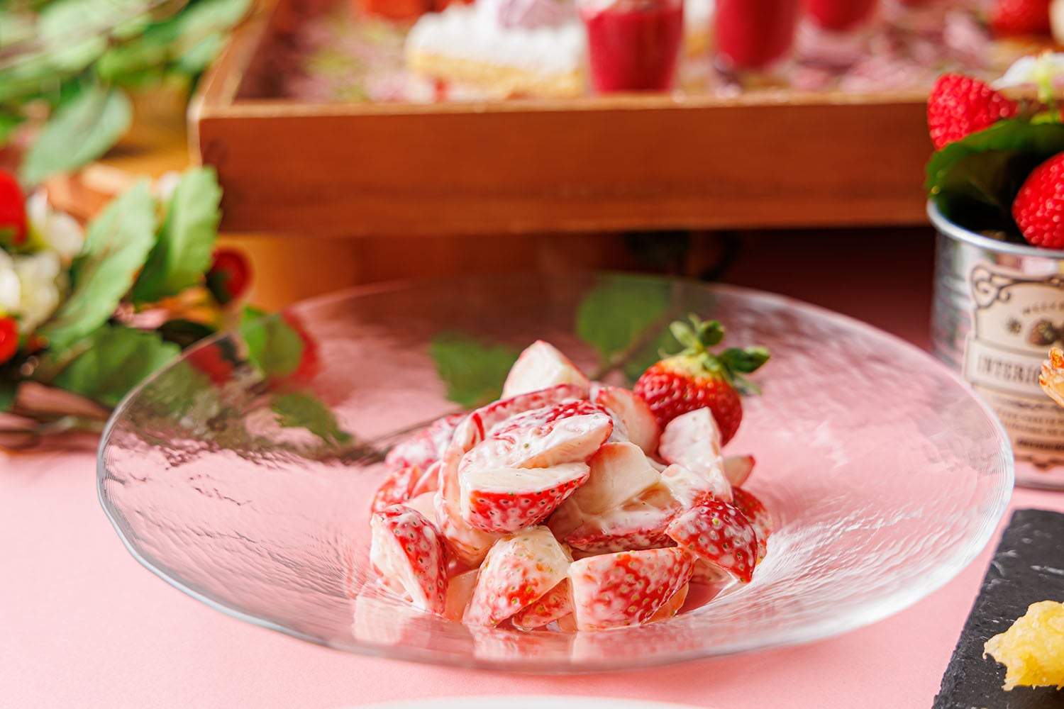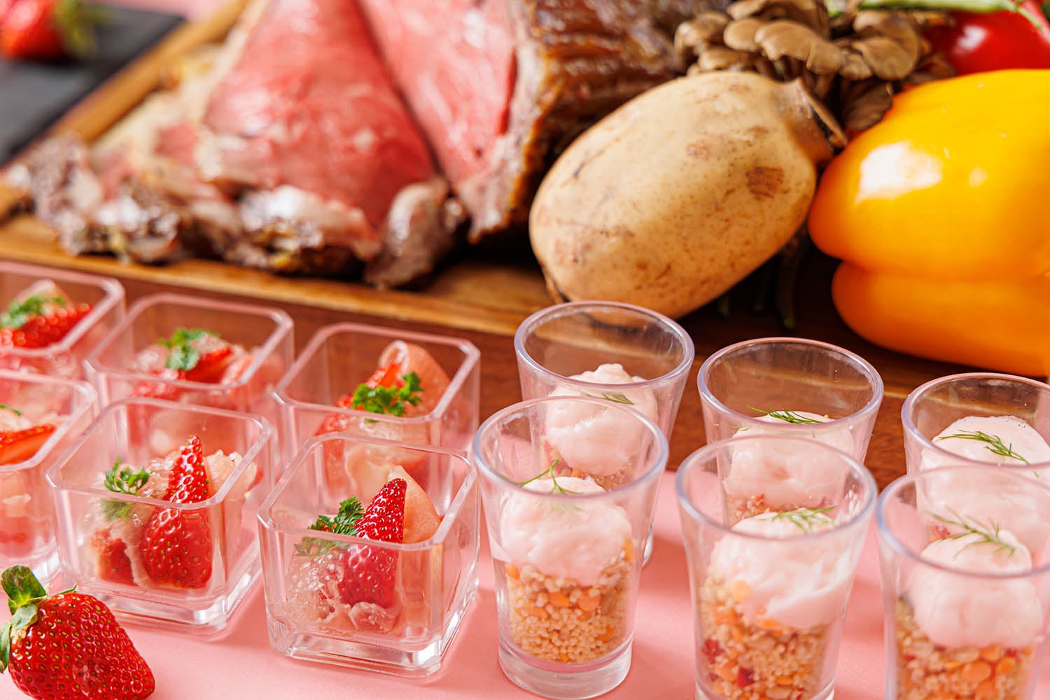 「ベリーベリーシャワー!~いちごのシャワーを浴びていちごまみれに~」をテーマにさまざまなメニューをラインアップ。生姜が爽やかに香る「いちごのマスカルポーネソース」や白ワインジュレの食感が楽しめる「生ハムといちごの白ワインジュレ添え」などの前菜ほか、オープンキッチンでお客様の目の前で切り分けて提供する「ローストビーフ」は、いちごピューレと粒いちごが入ったオリジナルデミグラスソースでご提供いたします。
