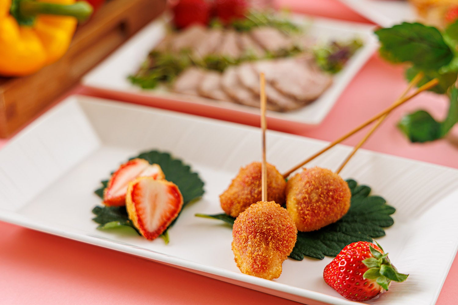 また、注文を受けてからきめ細かい衣でカラッと揚げる「いちごの串カツ」や酢飯に生クリームとフレッシュいちごをトッピングした「いちごの軍艦寿司」、スパイシーな「いちごのホワイトカレー」など、旬のいちごをたっぷり使った和・洋・中の創作料理の数々、全20種類が登場します。