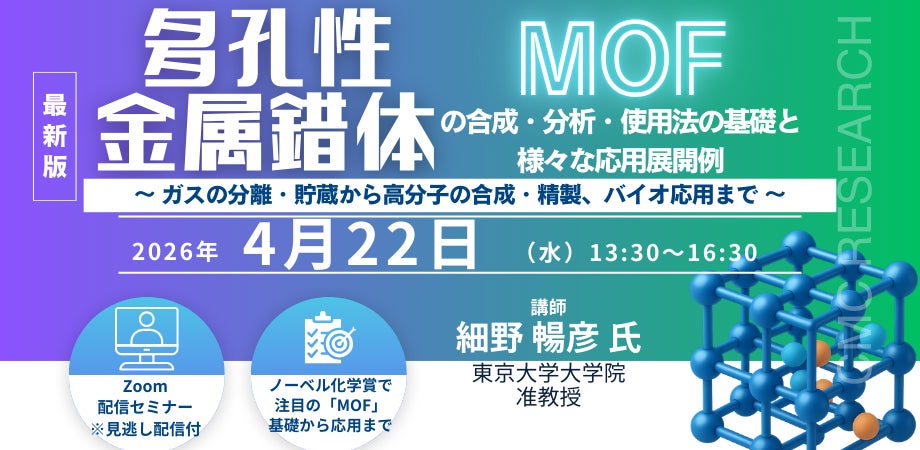 【ライブ配信/Zoom】「多孔性金属錯体(MOF)の合成・分析・使用法の基礎と応用展開例~ガスの分離・貯蔵から高分子の合成・精製、バイオ応用まで〜」セミナー 4月22日 主催:シーエムシー・リサーチ