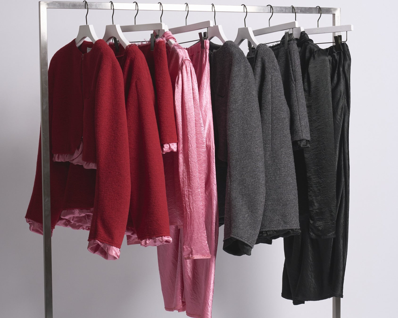 リアルに自分が欲しいものを考えながら、デザインに落とし込んだというアイテムは縫い目にカットオフを施し、袖や裾からサテンがのぞくギミックが効いたラインアップ。