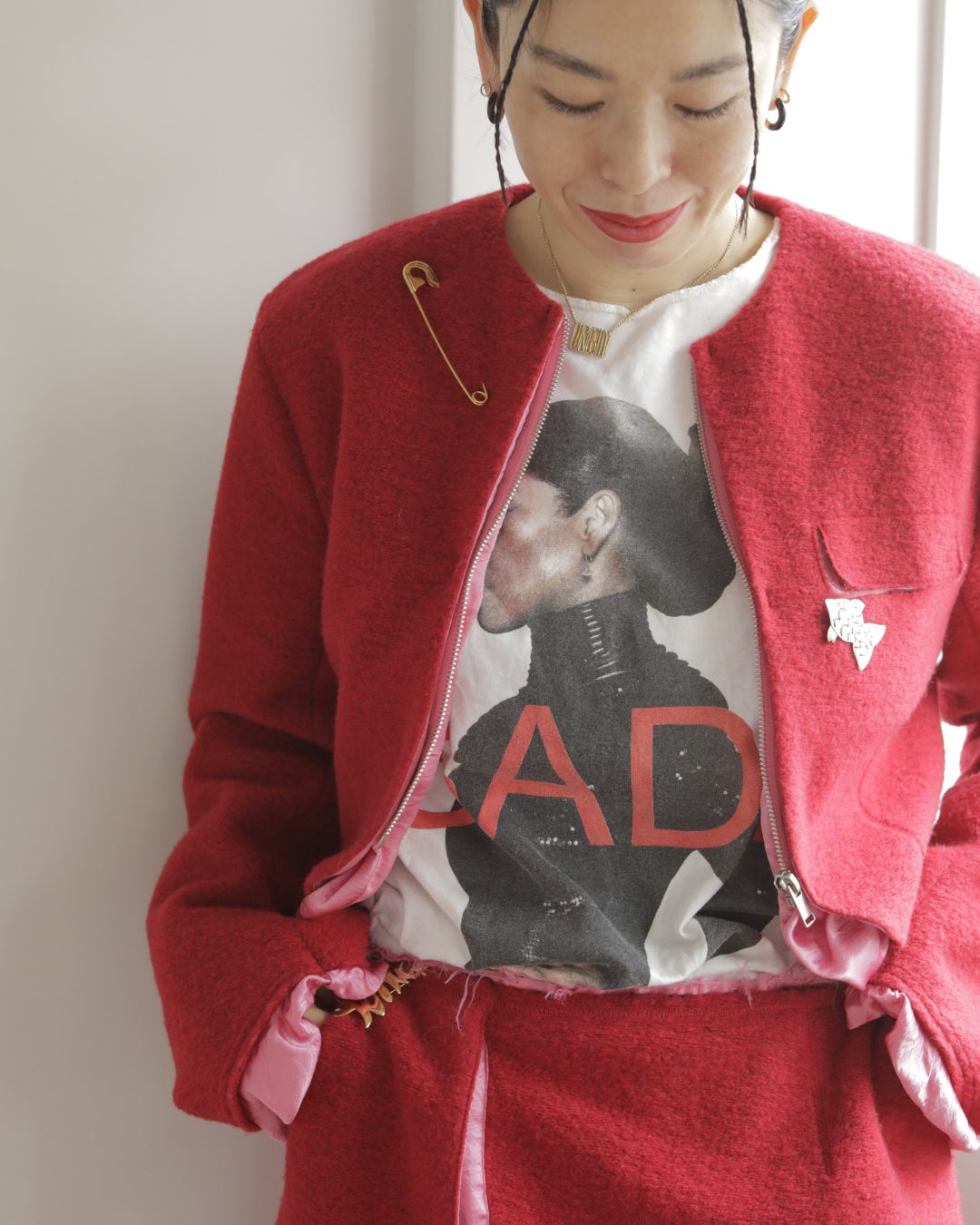 コンパクトなサイジング、フェミニン×グランジ、そこにリラックスした雰囲気をまとうスタイリングが気分だという長尾さんのセンスが光るバランスが、他にはないデザインに。