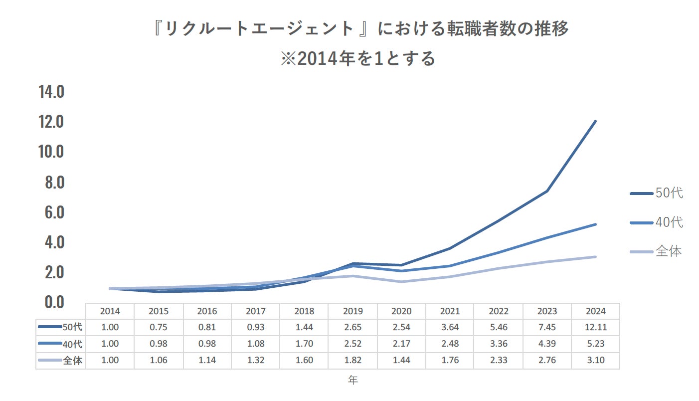 少子高齢化を背景とする構造的な人手不足に加え、企業は事業変革のために豊富な知見・経験を持つ人材を求めており、『リクルートエージェント』の転職者データを分析すると、40代・50代の転職者数の伸びは、全体よりも大きいことが分かる。