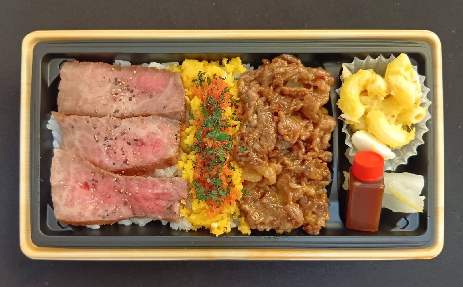 脂がのった鹿児島県産の黒毛和牛モモステーキを低温調理でより柔らかくジューシーに焼いたステーキと、同じく鹿児島県産の黒毛和牛肉スライスを甘辛い焼肉にしたダブルの味が楽しめるお弁当。