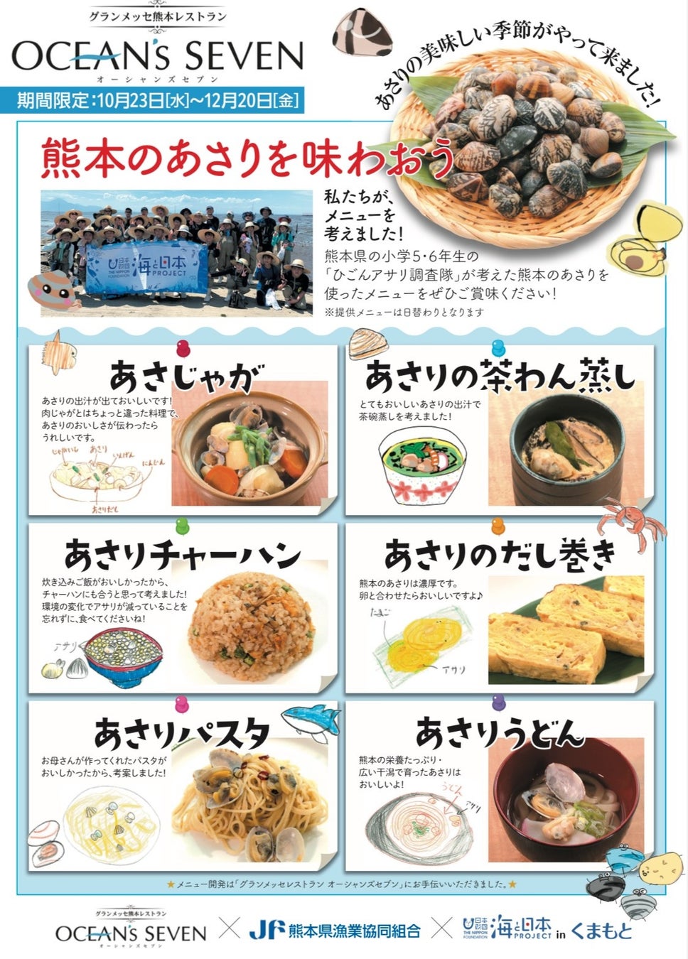 このコラボメニューは、2024年8月に熊本県で実施した環境学習イベント「ひごんアサリ調査隊~熊本のアサリを守ろう~」に参加した小学生達が考案し、グランメッセレストラン オーシャンズセブンのご協力のもと実現しました。また、熊本県漁業協同組合連合会の協力のもと料理には熊本県産のあさりを使用しています。子ども達が考案したメニューの中から「あさじゃが」「あさりの茶わん蒸し」「あさりチャーハン」「あさりのだし巻き」「あさりパスタ」「あさりうどん」の6品をビュッフェで提供。コラボメニューには、アサリが減少している熊本の海の状況が届きますようにという想いがこめられています。コラボメニューは10月23日(水)~12月20日(金)の期間、グランメッセ熊本2階のグランメッセレストラン オーシャンズセブンで提供されます。