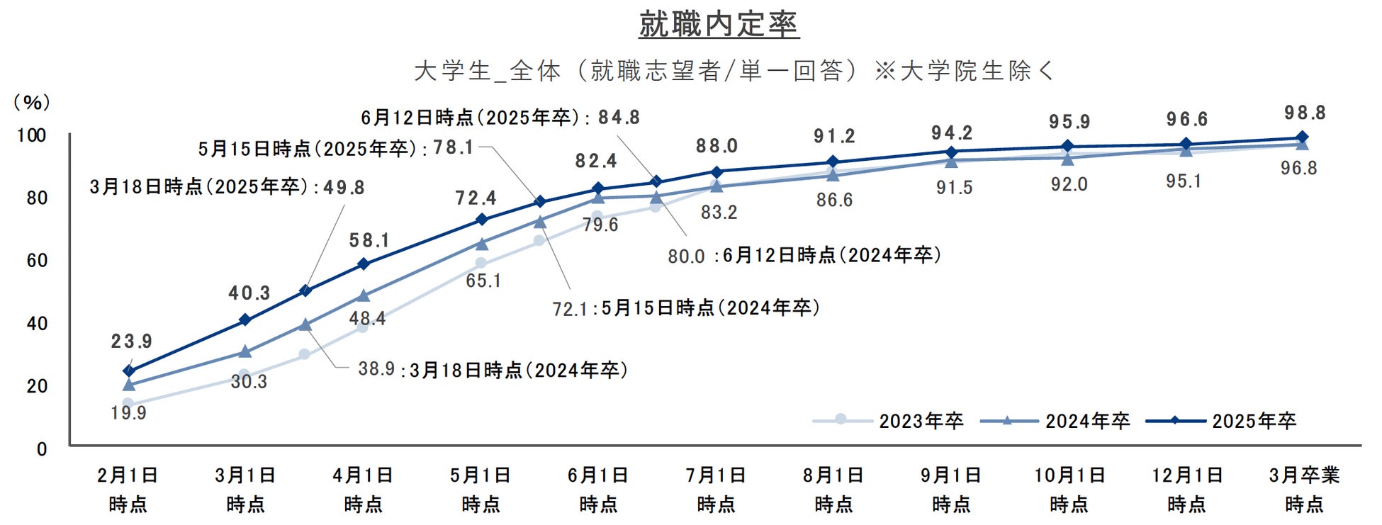 就職内定率は98.8%。企業の選考や内定出しのスケジュールが前年より早まっている様子