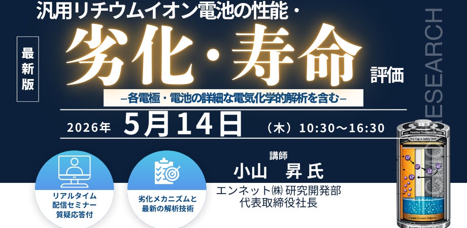 【ライブ配信セミナー】汎用リチウムイオン電池の性能・劣化・寿命評価– 各電極・電池の詳細な電気化学的解析を含む – 5月14日(木)開催 主催:(株)シーエムシー・リサーチ