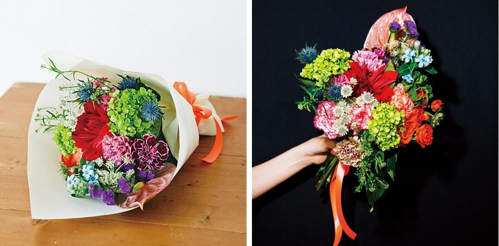 カーネーション8本、アジサイ2本、ダリア、アンスリューム、ブルースター、バラ、スプレーバラ、スターチス、エリンジウム、レースフラワー、タラスピ、アストランチア……スタイリストが『しあわせを贈る母の日』カタログの表紙用に特別にコーディネートしたこれらの花々を束ねました。11種類もの花をふんだんに詰め込んだ、高級感あふれる花束です。
