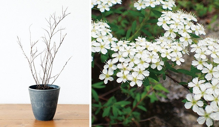 NHK連続テレビ小説のモデル、植物分類学者・牧野富太郎博士ゆかりの「高知県立牧野植物園」に咲く、牧野博士の植物愛を受けた土佐のお花です。四国の固有種「土佐しもつけ」は高知と徳島の固有種で、高知では四万十川流域の岩場などに自生する落葉低木です。初夏、発芽後に小さな白い花が開花し、秋には紅葉も楽しめます。初心者でも育てやすく、地植えすれば2メートルほどになりシンボルツリーにも。