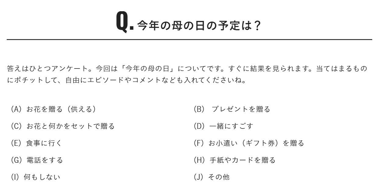 「Q.今年の母の日の予定は?」回答するとすぐに結果が見られます>> https://feli.jp/s/pr2304074/1/