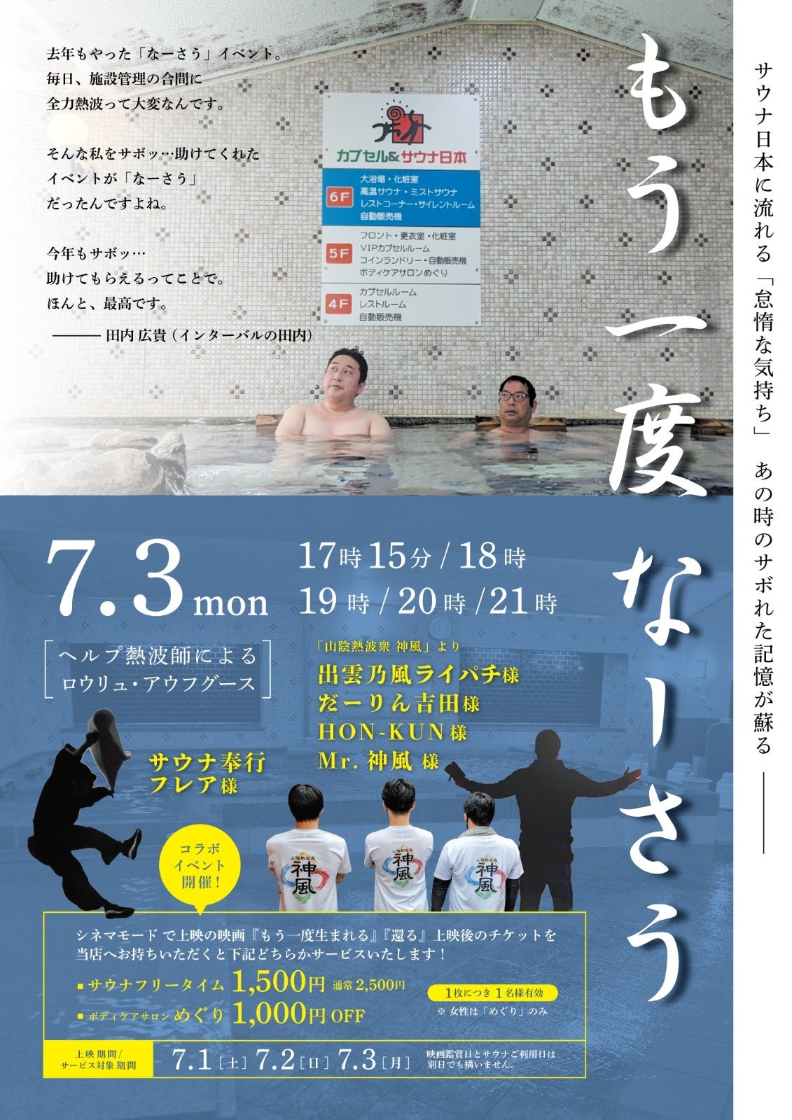3月7日が「サウナの日」、7月3日は「なーさうの日」とのことで、 「カプセル&サウナ日本」では、映画『もう一度生まれる』の作品名とかけたコラボイベント「もう一度なーさう」が行われます。