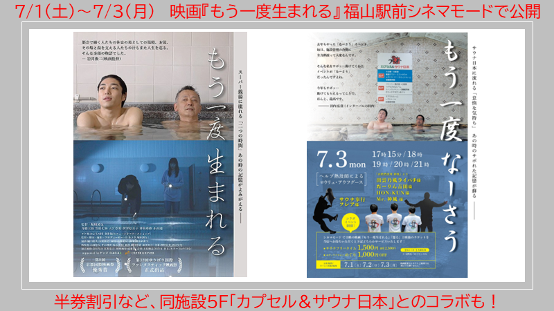【7/1(土)~7/3(月)】広島県福山市周辺のサウナーやお風呂好きの方におすすめ!映画『もう一度生まれる』 福山駅前シネマモードで公開