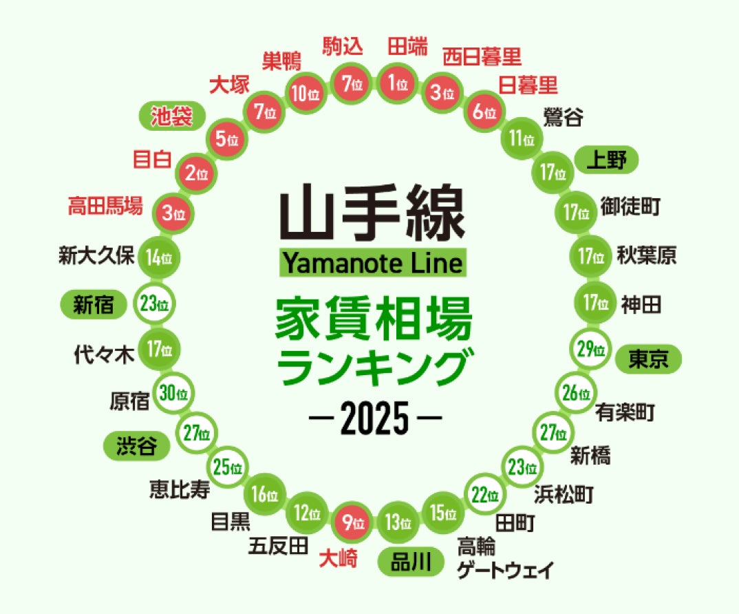 「JR山手線」沿線の家賃相場が安い駅ランキング2025年 1位は「田端駅」で9.1万円 安く住むなら北側に位置する駅が狙い目!