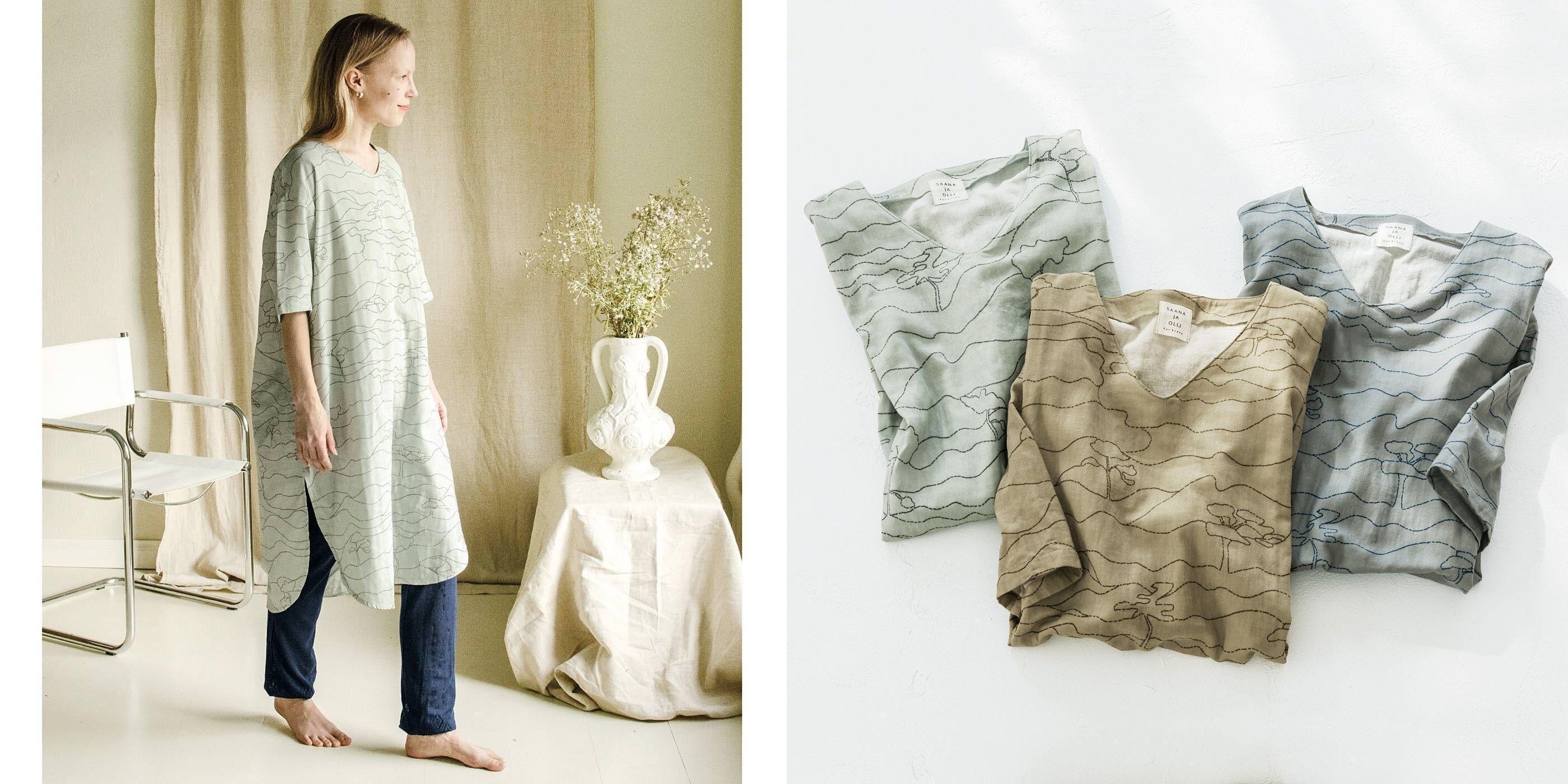 フィンランドの風景をテキスタイルにしたダブルガーゼのワンピースやUV&冷房対策アイテムのニットカーディガンなどがフェリシモ「SAANA JA OLLI for kraso」から登場