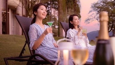 夕暮れ時の中庭テラスにバーカウンターを設置し、箱根の自然の爽やかさをイ メージしたシーズナルカクテルを提供します。この土地ならではの爽やかな味 をお楽しみいただき、夕食前に芦ノ湖を渡る風を感じて過ごす涼な提案です。