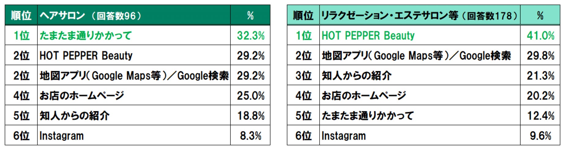 ヘアサロンにおける来店のきっかけは、「たまたま通りかかって」という偶然の発見が最も高い割合(32.3%)を占めており、立地が集客に与える影響の大きさが分かります。一方、リラクゼーション・エステサロン等では「HOT PEPPER Beauty」を通じた来店の割合が最も高く(41.0%)、サロン探しにおいてオンライン予約・検索サービスが重要な役割を果たしていることがうかがえます。「地図アプリ/Google検索」の影響も大きく(ヘアサロン29.2%、リラクゼーション・エステサロン等29.8%)、Web上での検索性や露出の強化が来店機会の創出につながっていると考えられるでしょう。