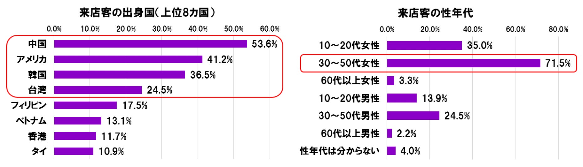 美容サロンを訪れるインバウンド客の出身国としては、中国、アメリカ、韓国、台湾の割合が特に高い傾向にあります。また、性年代別では、30~50代女性の来店割合が突出して高く、この層が現在のインバウンド利用の中心となっていることが分かりました。