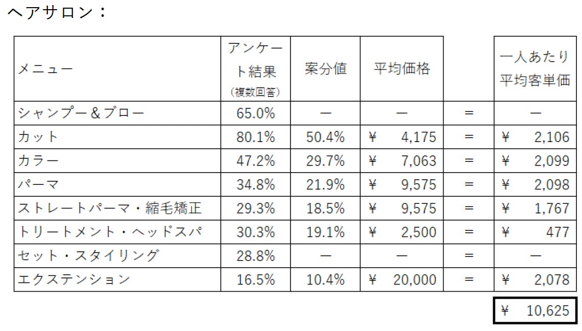 ※案分値:1人あたりメニュー選択数を1.5と仮定し、「シャンプー&ブロー」「セット・スタイリング」以外の選択率合計が150%になるように案分