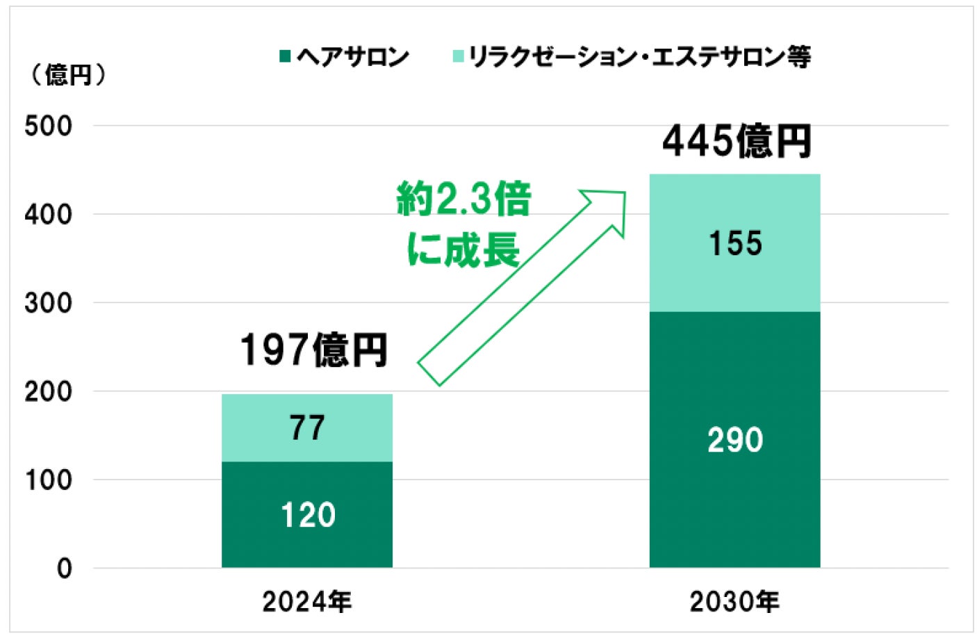 現在の美容サロンにおけるインバウンド市場規模を算出すると197億円となります。さらに今後の成長を考慮すると2030年には約2.3倍の445億円に拡大すると見込まれます。