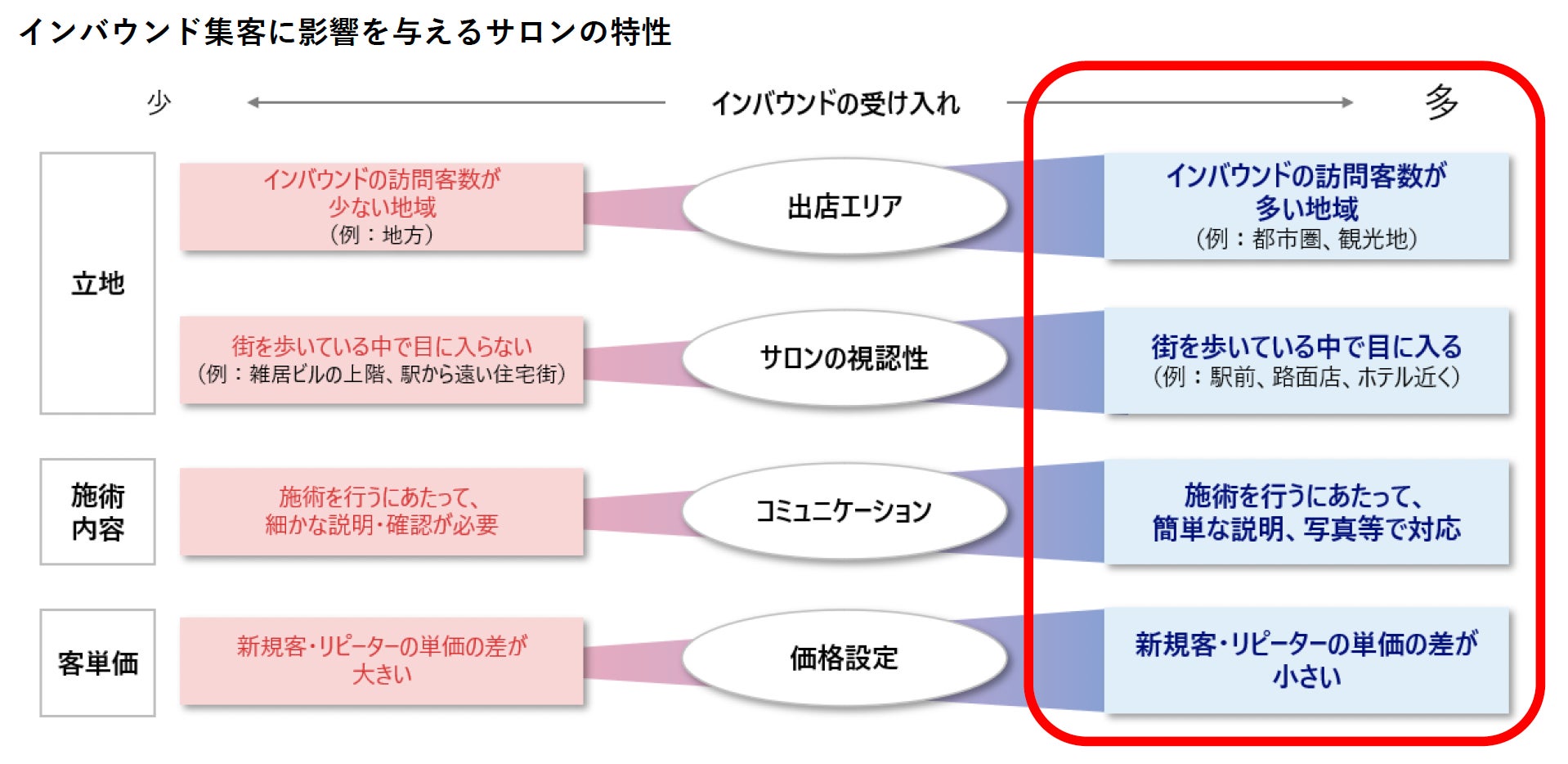 調査やサロンへのインタビューによりインバウンド対応のしやすさは、「立地」「施術内容」「客単価」といったサロンの特性によって大きく異なることが分かりました。特に、立地の影響が大きく、都市圏や観光地に位置するサロンほどインバウンド客を獲得しやすい傾向が見られます。