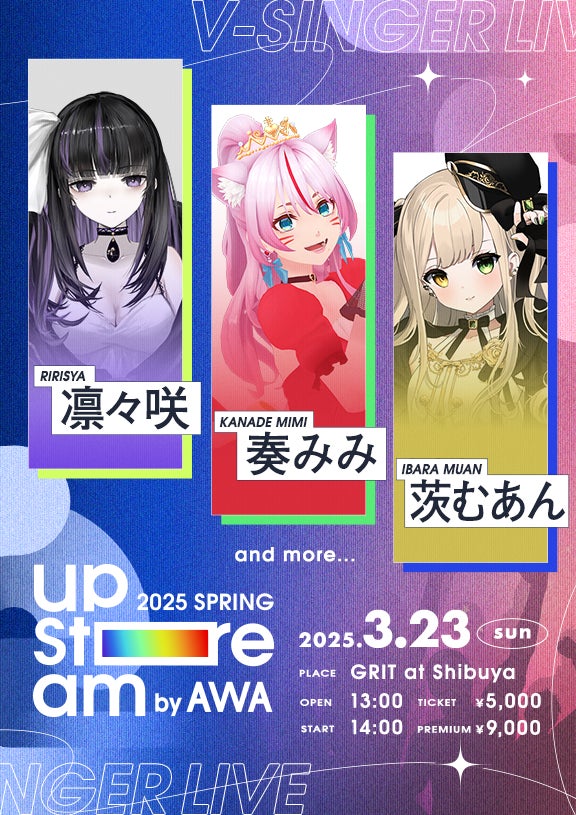 AWA主催のVアーティストによるリアルライブ『AWA UPSTREAM 2025 SPRING』開催!出演アーティスト第一弾として奏みみ、茨むあん、凛々咲が決定