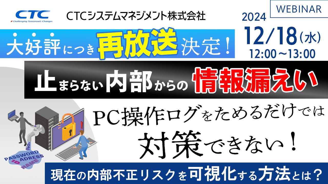 マジセミ株式会社は、大変好評をいただいた「【再放送】止まらない内部からの情報漏えい、PC操作ログをためるだけでは対策できない」というテーマのウェビナーを再放送します。