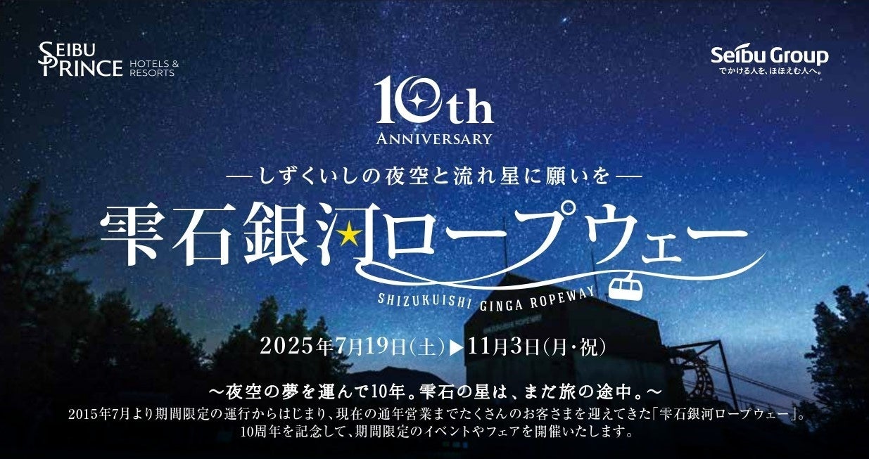 雫石スキー場(所在地:岩手県岩手郡雫石町高倉温泉、雫石地区総支配人:長澤 浩司)は、岩手県内唯一のロープウェーを所有しており、スキーシーズン以外にもアクティビティイベント「雫石銀河ロープウェー」として、夜の空中散歩や星空案内人による解説などを行い、日々変化する雫石の夜空をお楽しみいただいてまいりました。そして本年7月にはイベント10周年を迎えます。2015年7月より期間限定運行からスタートして現在の通年営業に至るまで、沢山のお客さまを運んできた「雫石銀河ロープウェー」。この度10周年を記念して、期間限定のイベント・フェアを7月19日(土)より開催いたします。