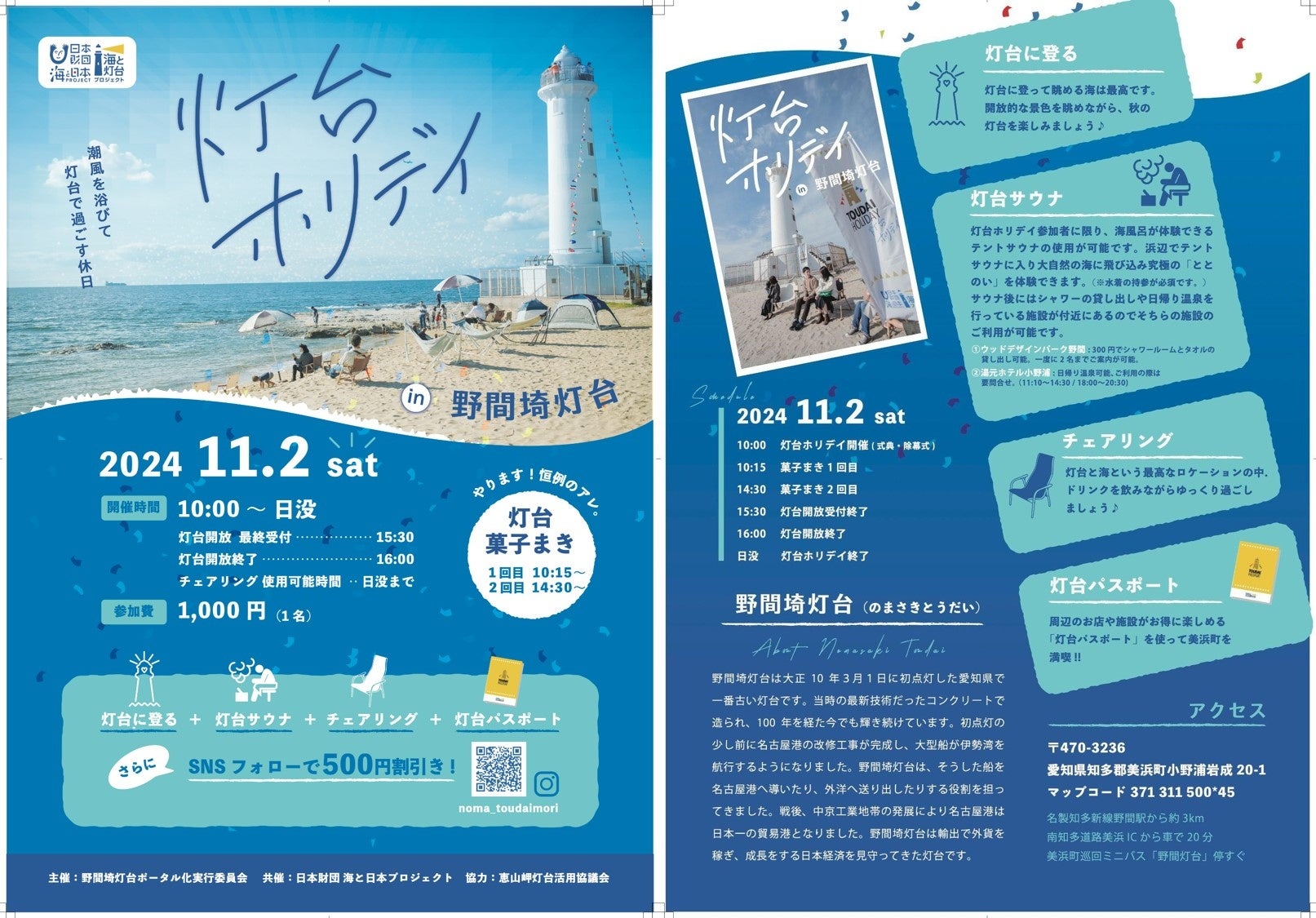 愛知県美浜町で町づくりや「野間埼灯台登れる化プロジェクト」を行う野間埼灯台ポータル化実行委員会(以下:当会)は、2024年11月2日(土)、「灯台ホリデイ in 野間埼灯台」を実施します。本イベントは、愛知県内で唯一登ることができる“野間埼灯台”に登ったり、海と灯台という絶景空間でアウトドアチェアに座って“チル”(まったりくつろぐ)、さらには、近隣の飲食店、お土産売り場等で使用できる割引・特典サービスが受けられる「灯台パスポート」の配布も予定しています。灯台の上から行う「菓子まき」では、灯台ホリデイ参加者の中から最大で5名様が灯台に登って菓子まきする貴重な体験もできます。また、灯台ホリデイ参加者に限り、海風呂に入ってととのうテントサウナのサービスもあります。