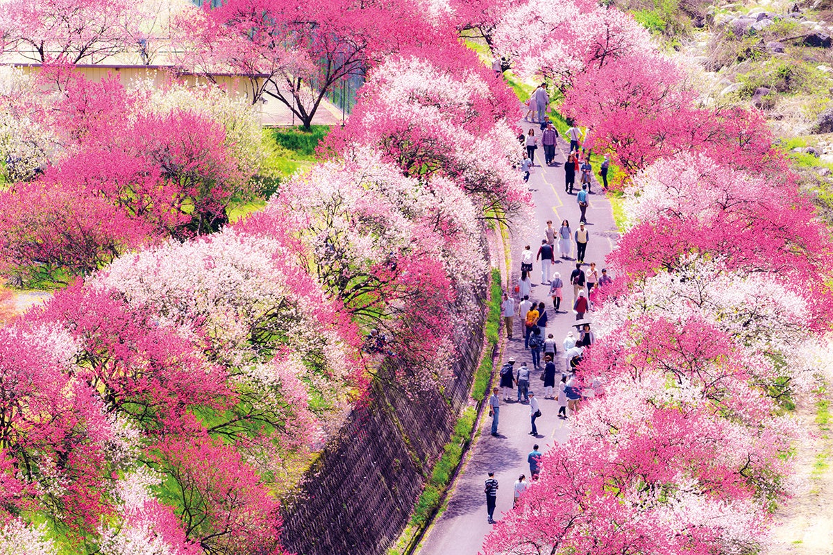長野県阿智村は全国有数の花桃の名所で、月川温泉郷の川沿いに広がる「花桃の里」では赤・白・ピンクの美しいグラデーションを眺めながら散策することができます。花桃は観賞用に改良された桃のことで、この川沿いには約5,000本の花桃が群生し、開花期はさながら桃源郷のような美しさです。