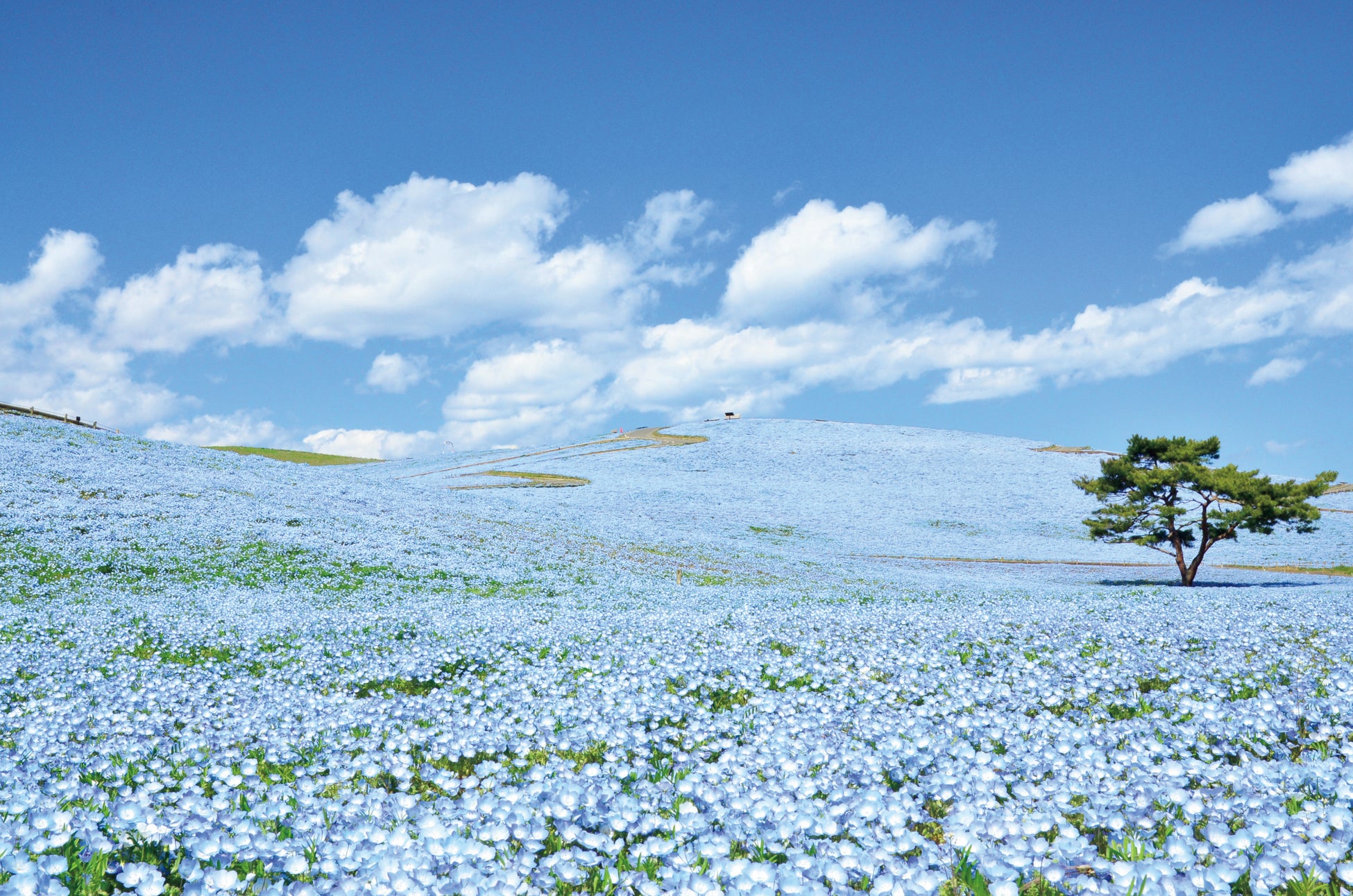 ネモフィラのおすすめスポットとして知られる「国営ひたち海浜公園」。「みはらしの丘」を埋め尽くす約530万本のネモフィラは、空の青と溶け合い一面をブルーに染める圧巻の景色。そのほか園内では、同時期にナノハナやチューリップ、ポピーなども楽しめ、色とりどりの春景色を存分に満喫できます。