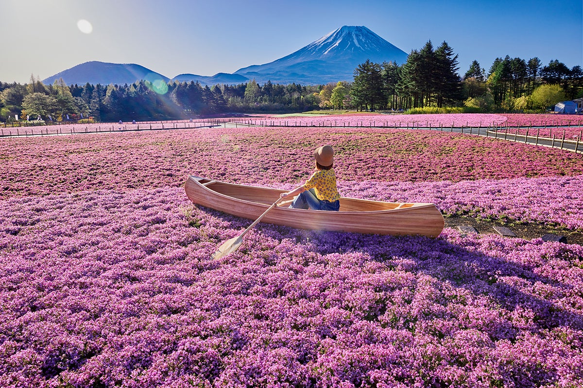 「富士芝桜まつり」は、富士山の雄大な姿を正面に望み、約50万株の芝桜が広大な園内を染め上げる迫力満点の春の風物詩。ピンクや紫など7種の芝桜が作り出す景色はまるで絵本のようなかわいらしさです。「ピンクの海を旅する小舟」といったフォトスポットも設置され、景観に溶け込む没入体験もかないます。