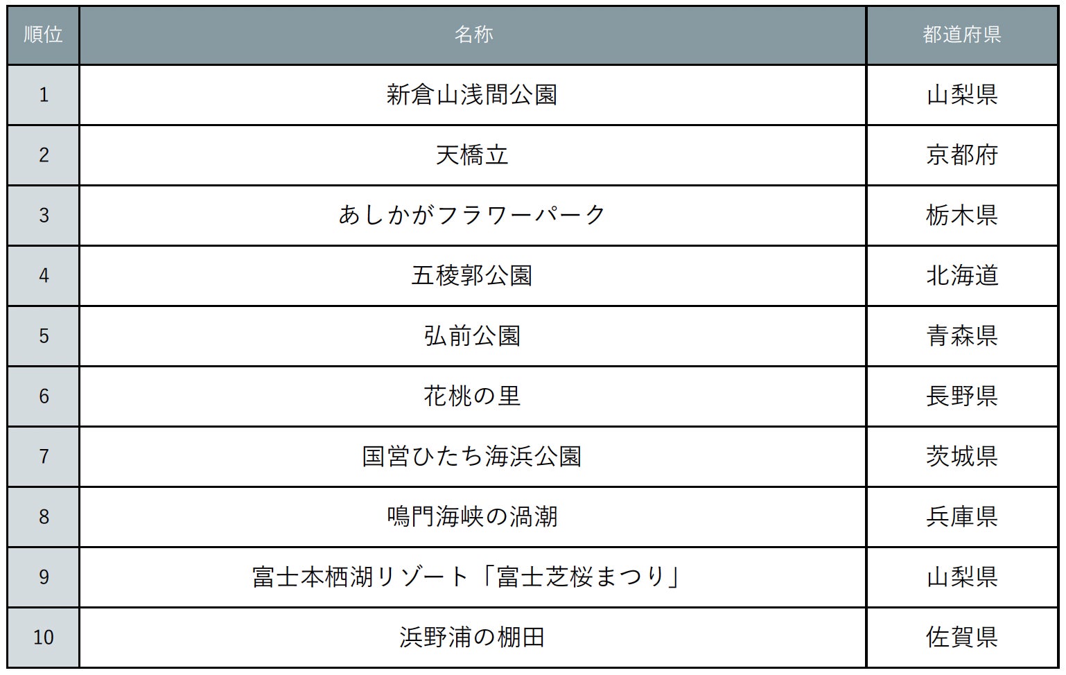 1位を獲得したのは山梨県にある「新倉山浅間公園」でした。富士山と五重の塔、桜が織りなす日本ならではの圧巻の春絶景が堪能できるスポットです。2位には日本三景のひとつ、京都府の「天橋立」がランクイン。白砂と松並木が続く絶景が広がり、春は桜とのコラボも楽しめます。続く3位は、春になると樹齢160年を超える大藤など350本以上の藤が咲き誇る栃木県「あしかがフラワーパーク」でした。そのほかトップ10には日本らしさが感じられる魅力的な春絶景がずらりと並ぶ結果となりました。