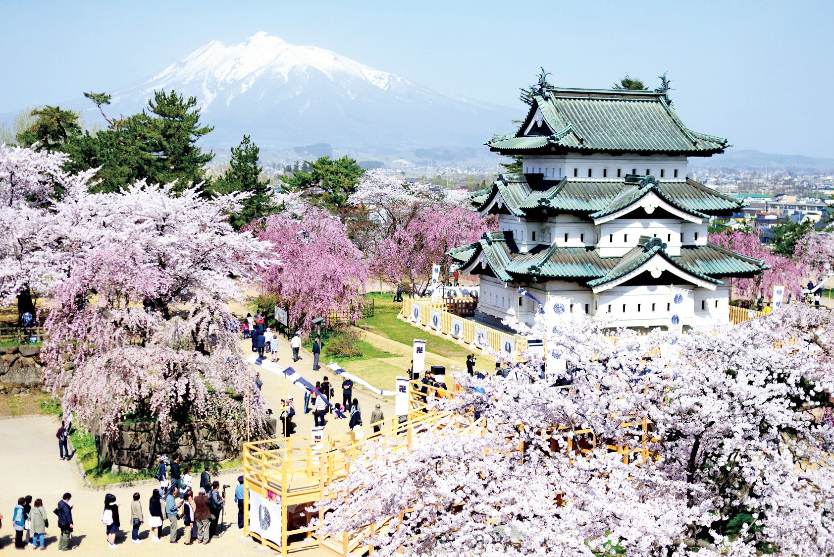 52種・約2,600本が花開く桜と古城の風雅な光景が楽しめる「弘前公園」。ひとつの花芽にたくさんの花が咲き、ボリュームのある桜が特徴です。公園内の弘前城天守は東北で唯一の現存天守で国の重要文化財にも指定され、天守や城門、櫓(やぐら)と織りなす景色は圧巻。西濠の桜のトンネルも人気です。