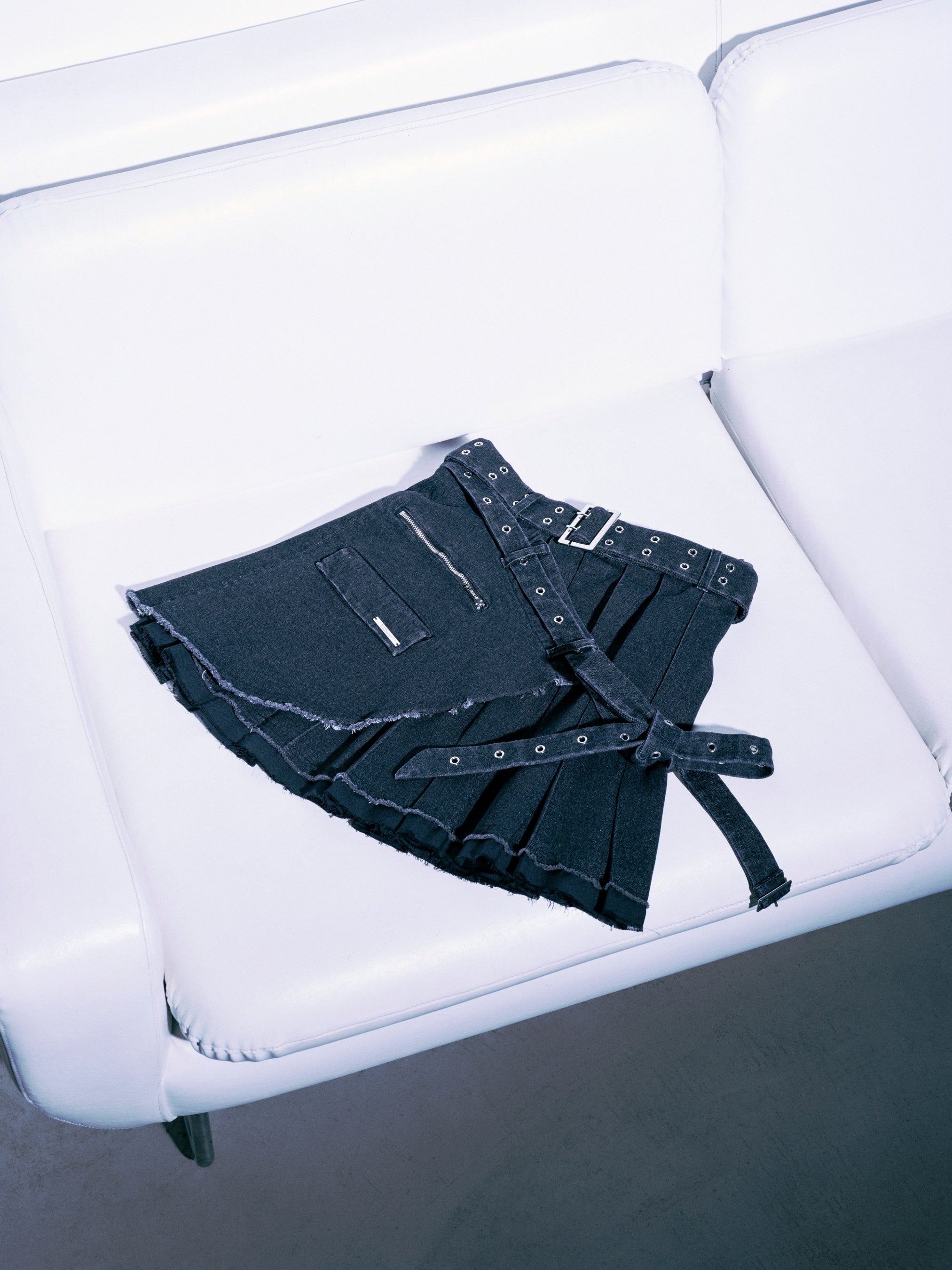 大胆なダブルベルト仕様と、クラッシュのきいた裾でかっこよく穿けるミニスカパン。ペチコート付き。