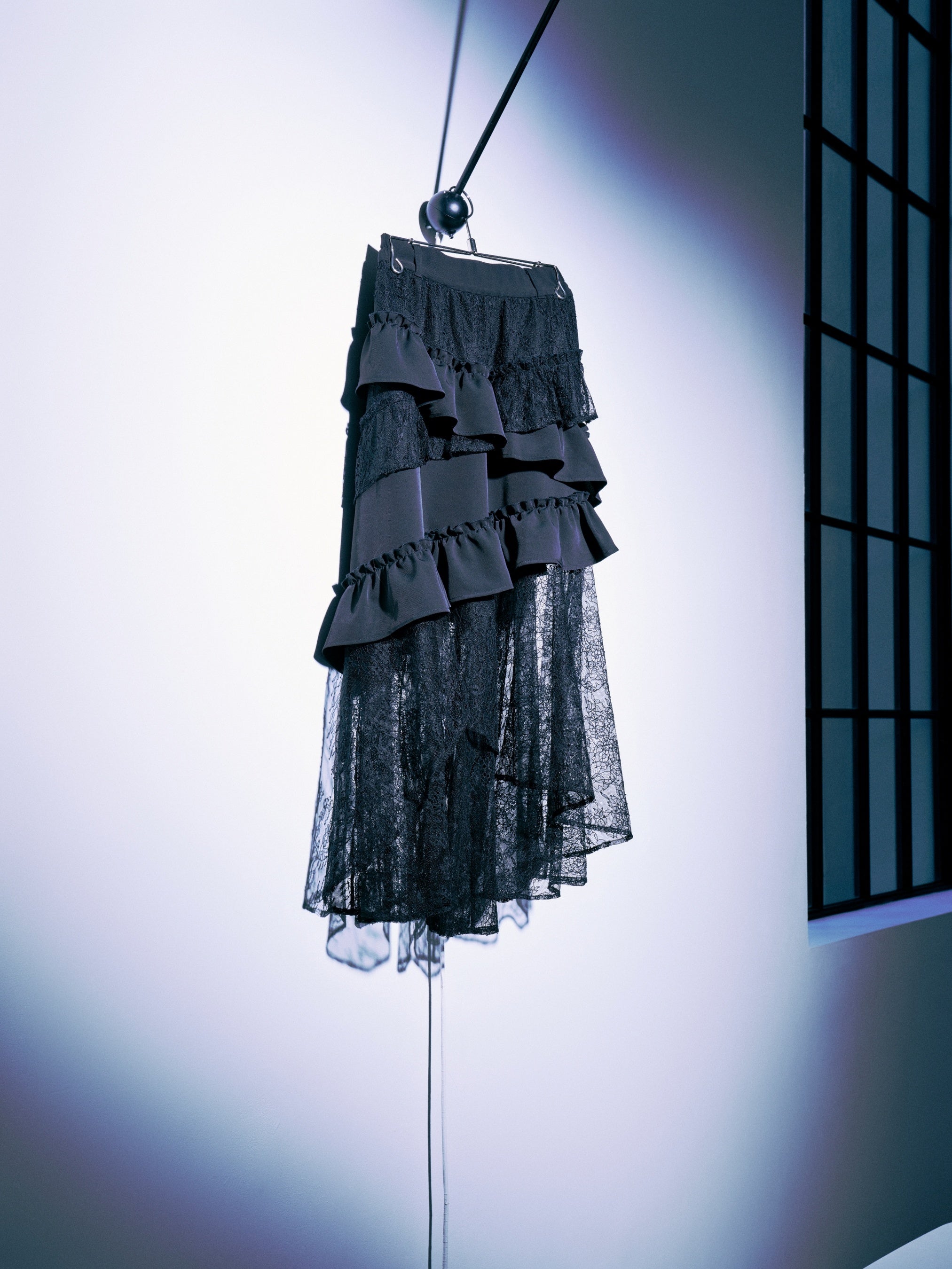 小松奈々のレイヤードファッションからインスパイアされたレースとフリルの多重レイヤードが美しいスカート。裾は透け感のあるレースで、パンツとのレイヤードスタイルもおすすめ。
