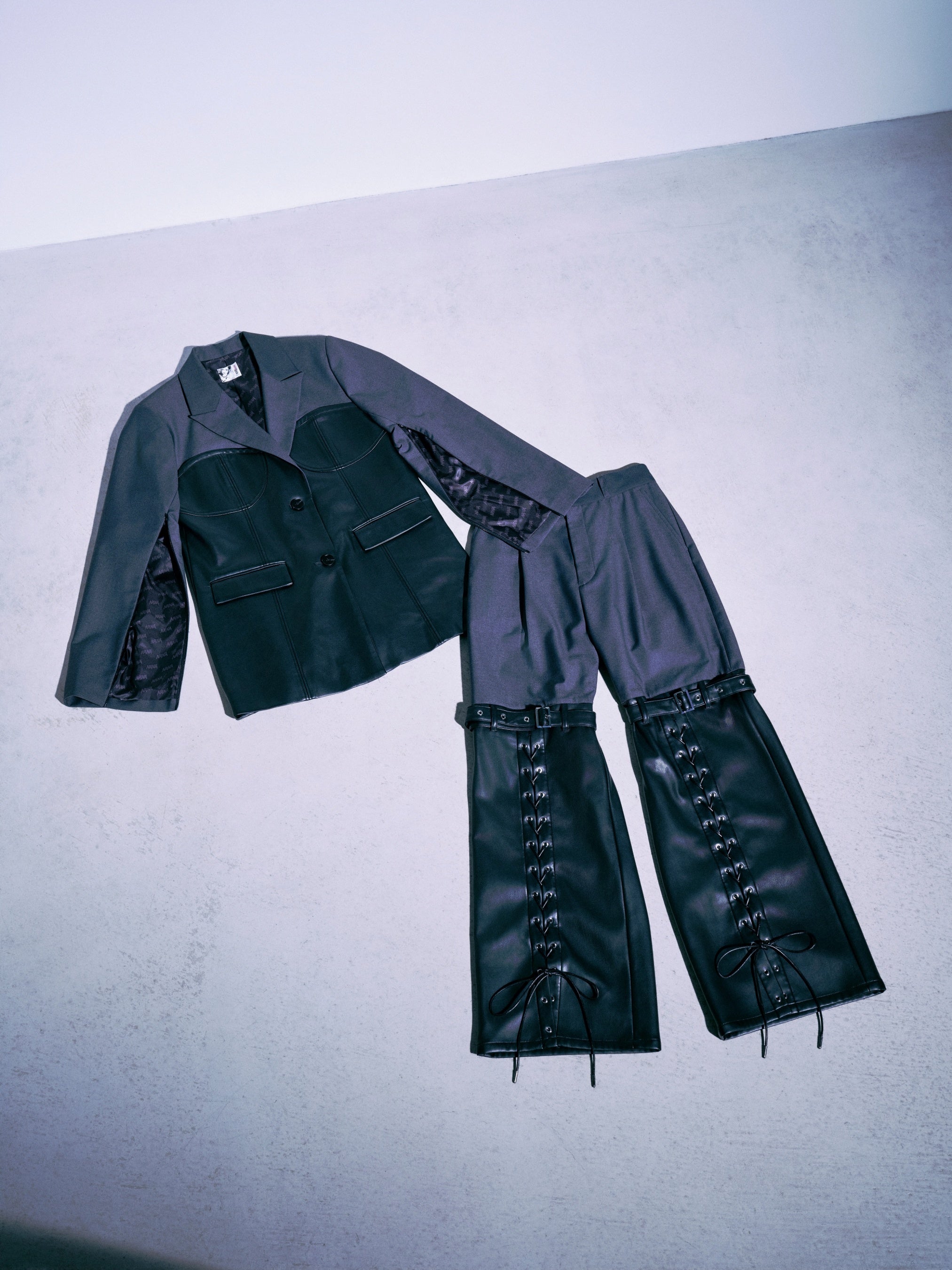 大崎ナナのパンクファッションからインスパイアされたセットアップ。そで下のZIPや、ひざ元のベルトでシルエットの変化を楽しめます。
