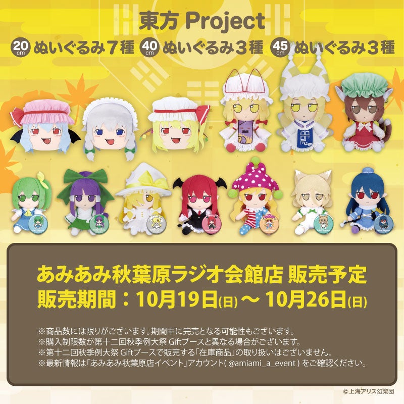 大網株式会社(本社・東京都文京区)は、自社が運営するホビーショップ「あみあみ秋葉原ラジオ会館店」にて、第十二回秋季例大祭の「Gift ふもふもぬいぐるみ」を、2025年10月19日(日)~10月26日(日)の期間で販売いたします。