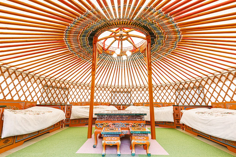 山に囲まれた立地で夏には川遊びができるほか、地元の新鮮な野菜が揃う道の駅で、併設する本場モンゴルの移動式住居「ゲル」に宿泊が可能です。中にはベッドなど家具や冷蔵庫、エアコンまであり、心地よい環境の中で遊牧民気分が味わえます。また、BBQ場は屋根付きなので天候を気にすることなく過ごせます。