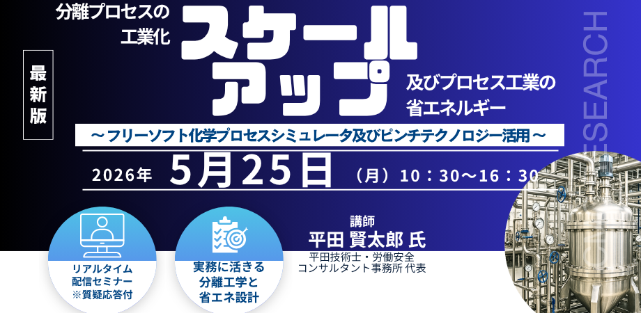 【ライブ配信/ZOOM】分離プロセスの工業化スケールアップ及びプロセス工業の省エネルギー~ フリーソフト化学プロセスシミュレータ及びピンチテクノロジー活用 ~セミナー開催(5/25、CMCリサーチ)